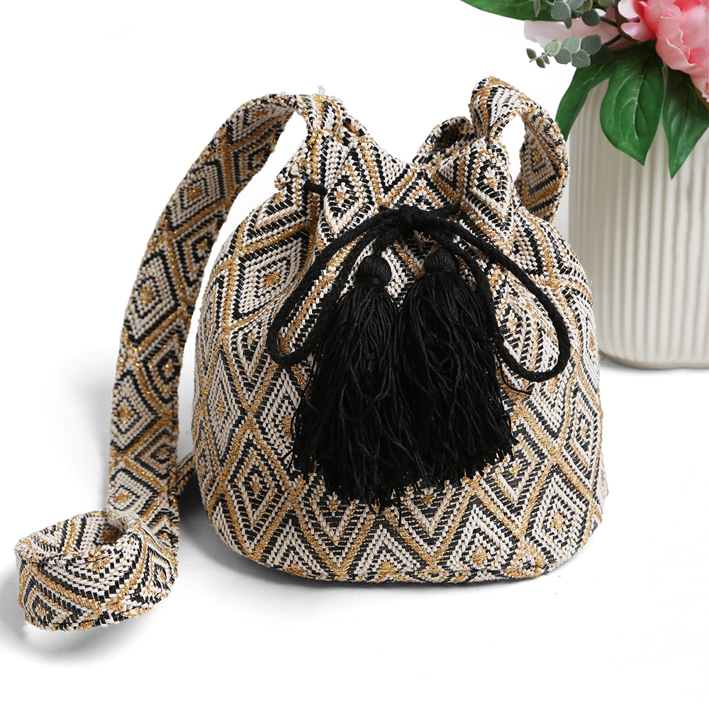 Boho Tribal Pattern Woven Tassel Drawstring Bucket Bag
