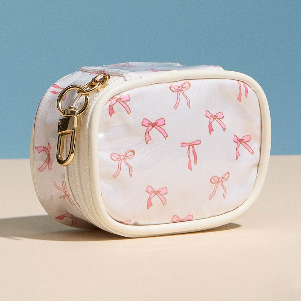 Details • Size : 4" X 3" X 2" • Zipper Closure • Compact mini zip pouch designed for easy organization of small essentials like cosmetics, accessories, keys, or travel items. Features a secure zipper closure, structured shape for easy access, and a convenient clip for attaching to bags or luggage. Perfect for everyday carry, travel organization, or gifting.
