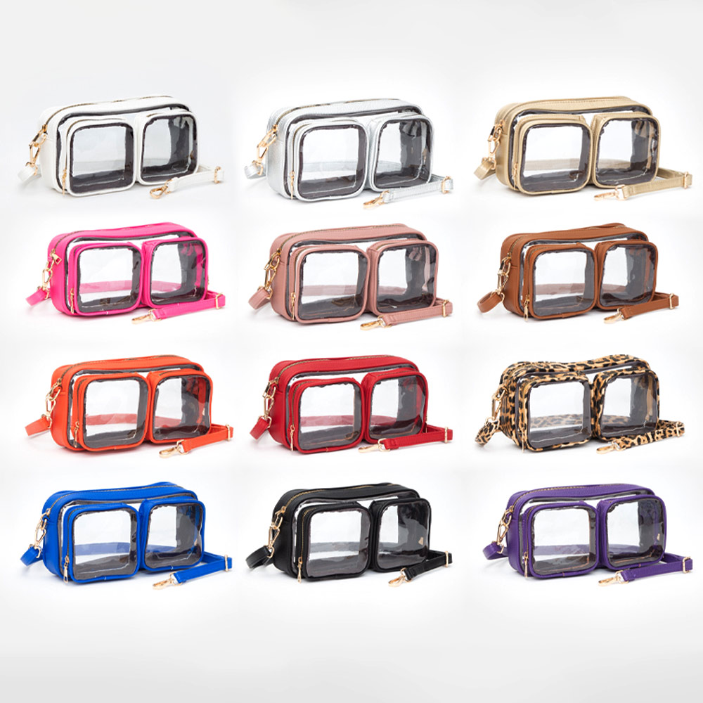 Details • Size : 10" X 4" X 5" • Strap Size : 41" L / Adjustable, Detachable • 2 Outside Zipper Pockets • Zipper Closure • Stay organized and event-ready with this clear stadium crossbody bag featuring dual front zip pockets and an adjustable strap. Compliant with venue regulations and perfect for concerts, sports games, and travel.