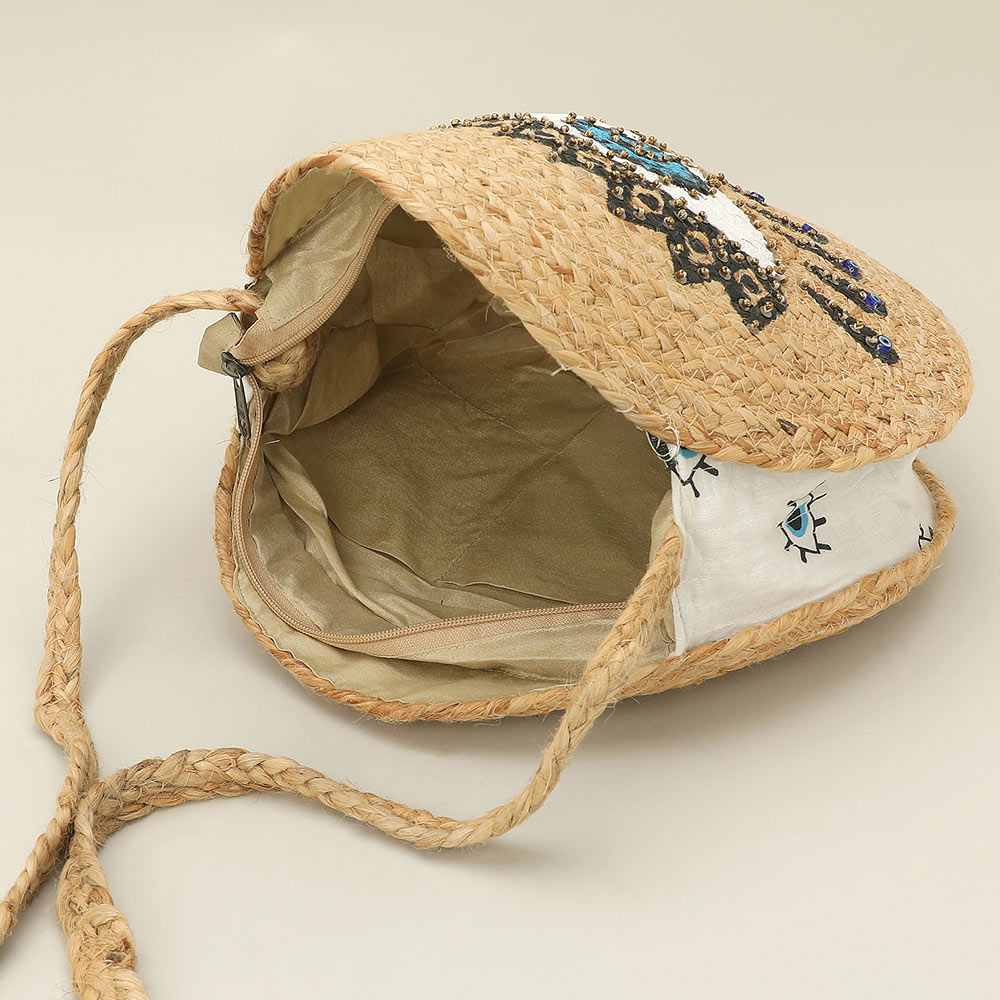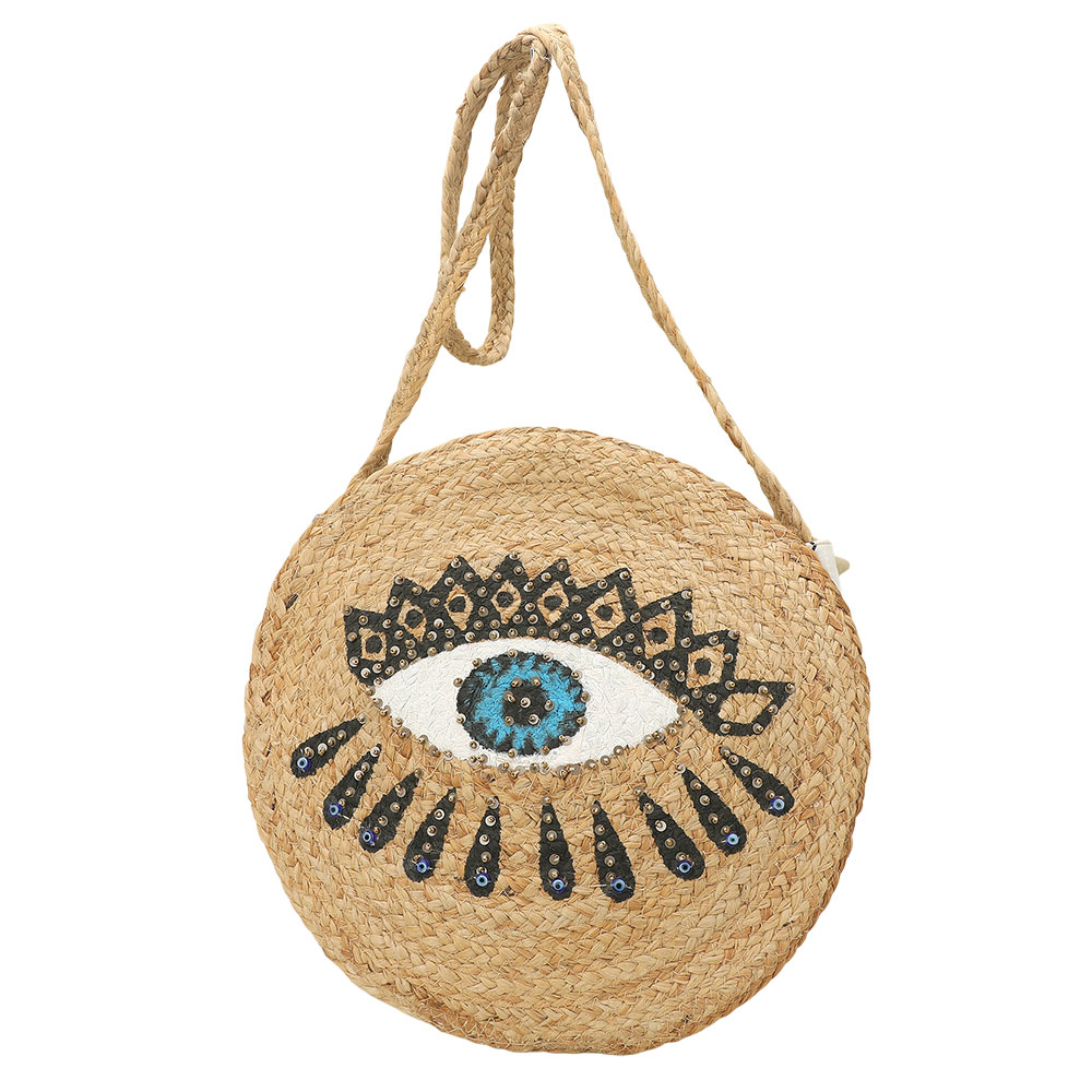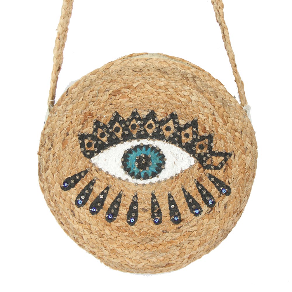 Details • Size : 13" X 13" X 3.25" • Strap Size : 18.5" L • Two Inside Slip Pockets • Zipper Closure • Statement round shoulder bag designed with a bold evil eye motif and detailed embellishment for standout everyday style. Compact yet functional interior holds daily essentials with ease. Lightweight and easy to carry, ideal for vacations, festivals, and boutiques seeking trend-forward, eye-catching accessories. • Made In India
