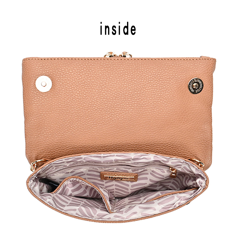 • Elevate your look with this crossbody clutch featuring a sleek fold-over flap and dual zipper accents. Designed with a slim chain strap, this compact handbag offers the perfect mix of elegance and practicality for day-to-night wear.