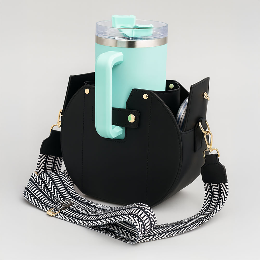 • Functional crossbody cup carrier bag featuring a structured silhouette, secure top closure and wide adjustable strap. Designed to hold cups or tumblers while offering space for daily essentials, making it ideal for travel, errands and hands-free convenience.