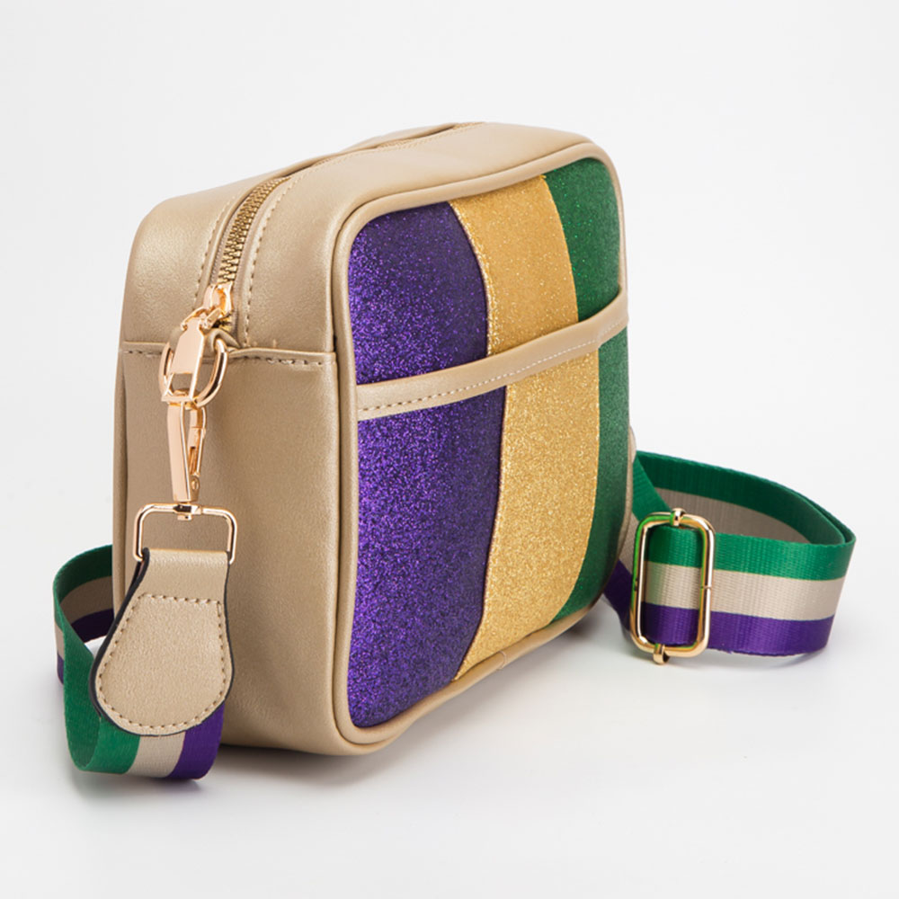 • Glitter crossbody bag with festive Mardi Gras colors and a detachable strap. Roomy, lightweight, and parade-ready—perfect for hands-free celebration.