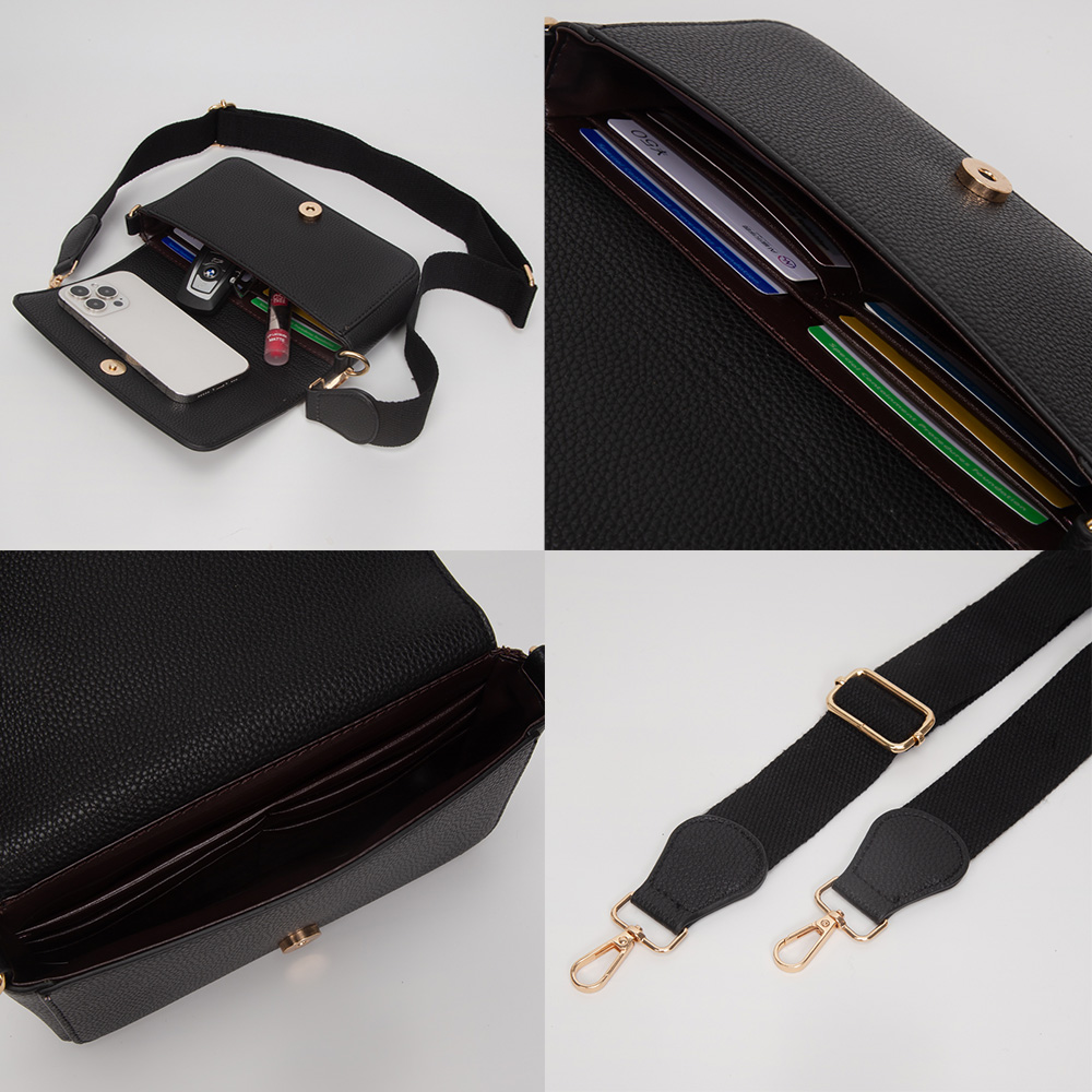 Details • Size : 8" X 4" X 2" • Strap Size : 52" L / Detachable, Adjustable • 6 Inside Card Slots • Magnetic Closure • Stay stylish and organized with this structured mini crossbody bag. Featuring a sleek silhouette, secure flap closure, and adjustable wide strap, it blends functionality with modern elegance—perfect for daily wear, travel, or effortless hands-free convenience.