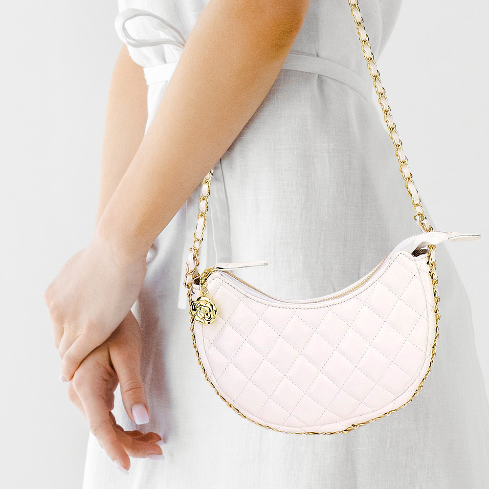 • Chic half-moon shoulder bag with woven texture and chain strap. A modern accessory for a sleek everyday look, combining elegance and practicality for day-to-night style.