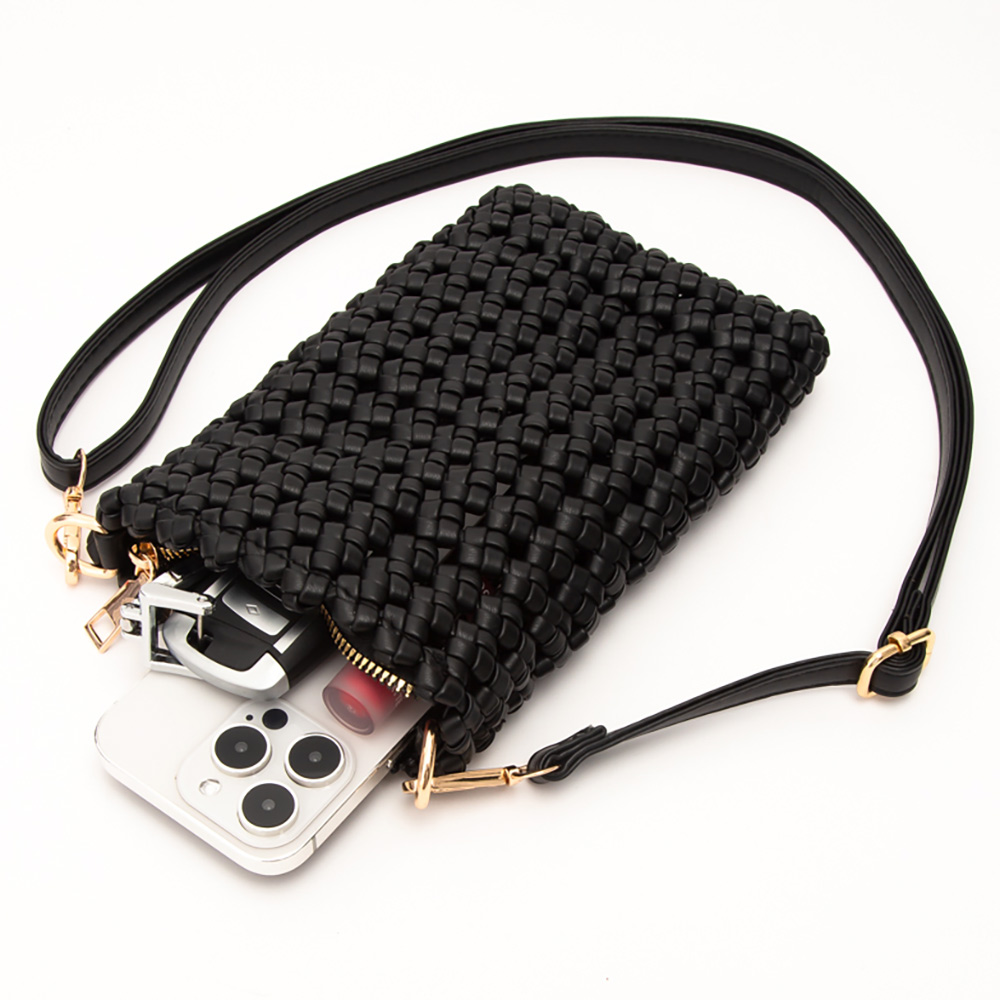 • Chic woven crossbody bag designed for phones and essentials. Features an adjustable strap and sleek finish, perfect for everyday wear, travel, or events. Lightweight and hands-free convenience.