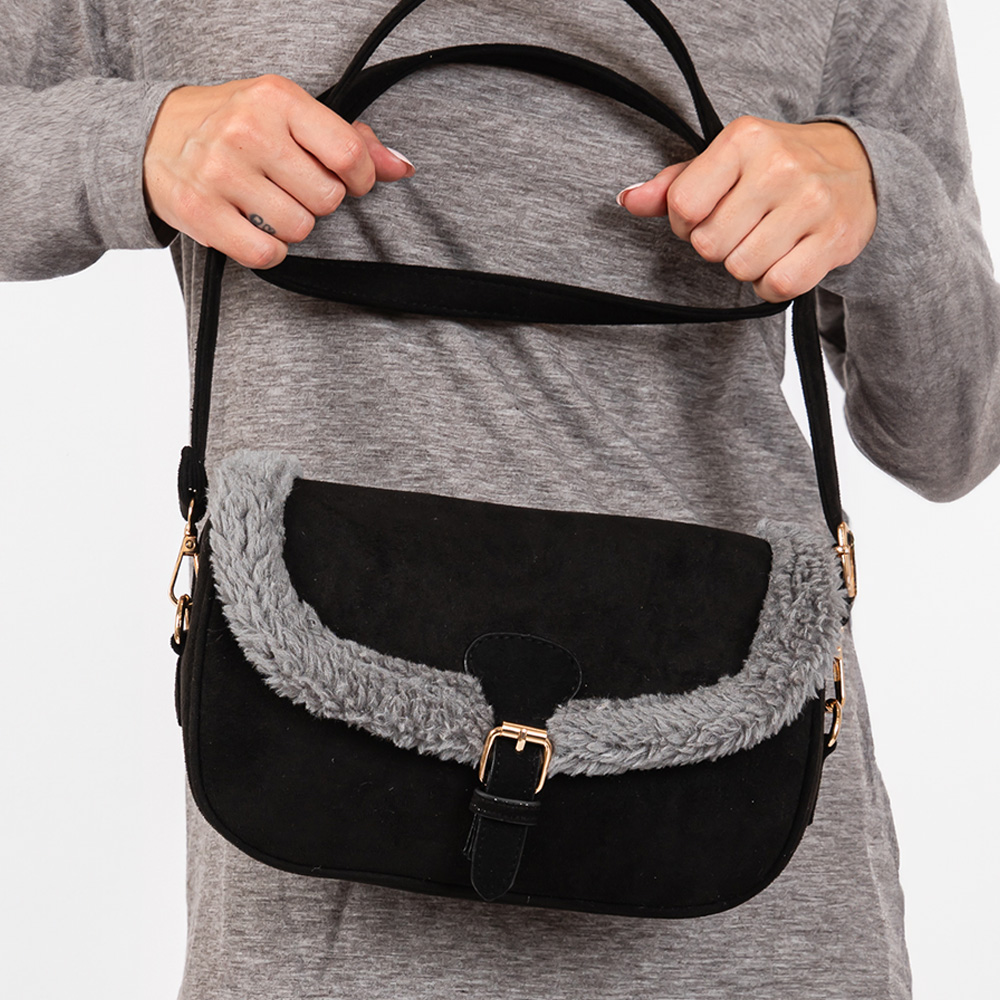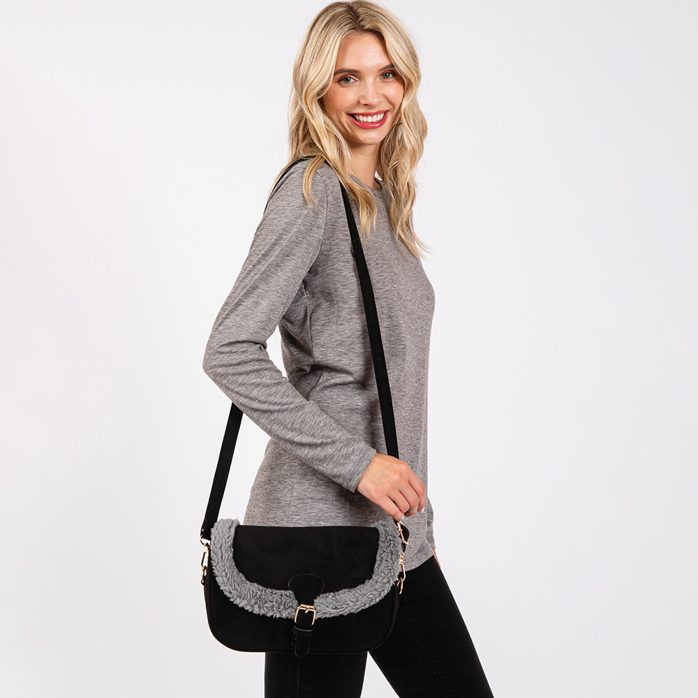 Pearl Handle Accent Faux Fur Crossbody Bag