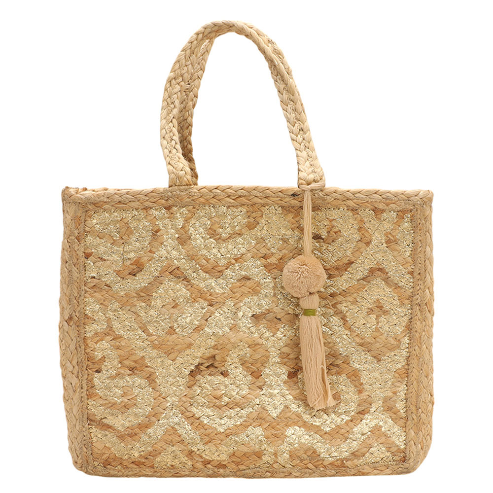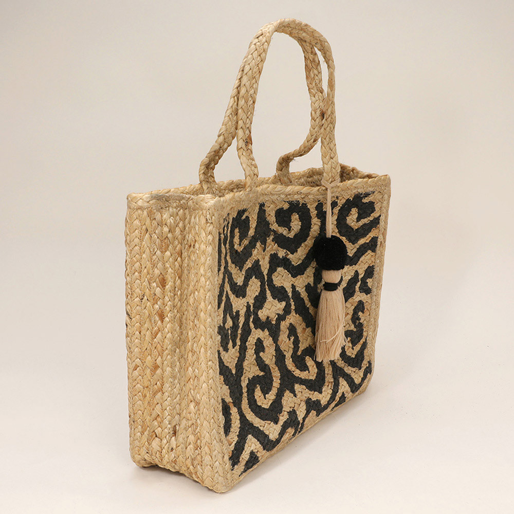 Details • Size : 16" X 12" X 4.5" • Top Handle Size : 8" L • Tassel Size : 10.5" L / Detachable • Elegant structured tote bag designed with an allover textured pattern and a decorative tassel accent for refined everyday style. Spacious interior offers ample room for daily essentials while maintaining a polished silhouette. Ideal for shopping, work, or casual outings, making it a versatile statement accessory for boutiques seeking timeless, elevated tote bags. • Made In India