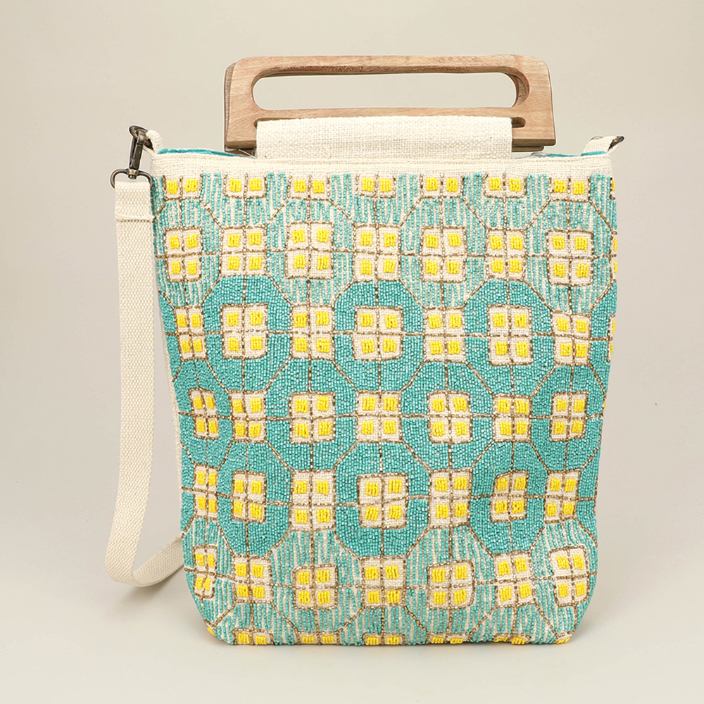 Handcrafted Beaded Boho Wooden Handle Tote / Crossbody Bag