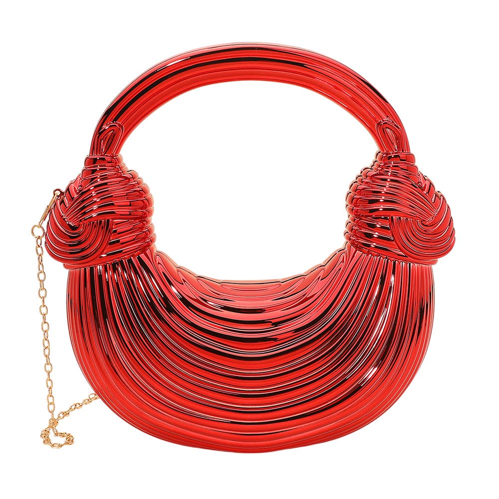 Details • Size : 10" X 10" X 3.25" • Top Handle Size : 5" L • Strap Size : 46" L / Detachable • Magnetic Closure • This sculpted fashion bag features a distinctive loop-handle silhouette with layered, curved ridges that create a bold, fluid shape. A sleek chained detail adds versatility, making it an expressive accessory that elevates evening outfits and modern, statement-driven looks.