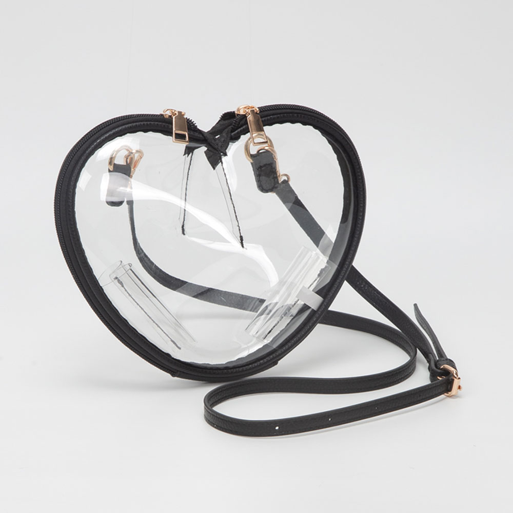 Details • Size : 8" X 8" X 3" • Strap Size : 47" L / Detachable, Adjustable • Stylish heart-shaped clear crossbody bag designed for concerts, events, and everyday outings. Compact yet practical for carrying essentials while staying hands-free. The transparent design meets venue requirements and adds a trendy statement to any casual or festive look.
