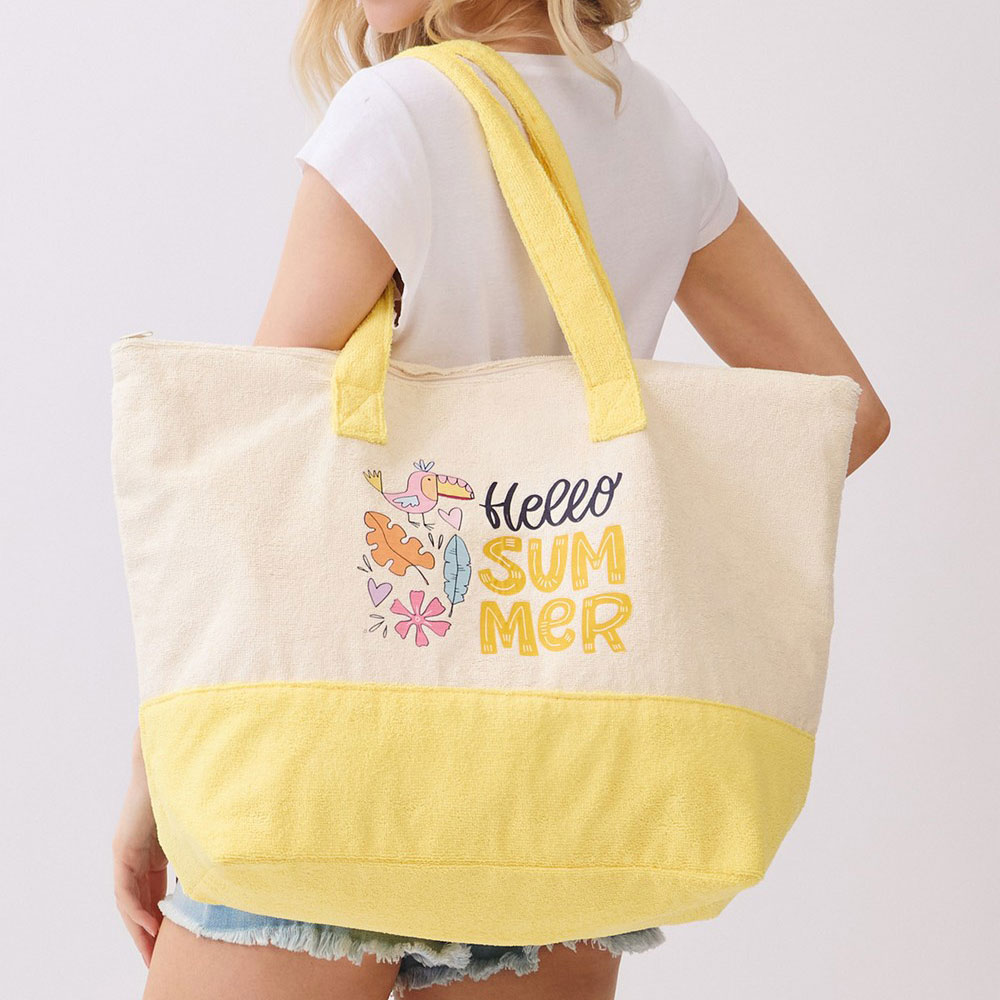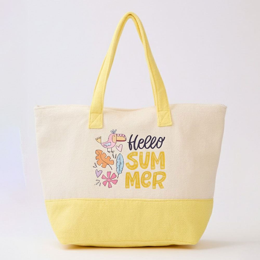 Details • Size : 22" X 16" X 6" • Inner Pocket • Zipper Closure • Material : 80% Polyester, 20% Polyamide • Fun summer themed tote bag featuring a cheerful “Hello Summer” graphic design. Ideal for beach trips, pool days, shopping, or vacation travel, this spacious carryall holds daily essentials with ease while adding a playful seasonal touch to warm weather outfits and getaway plans.