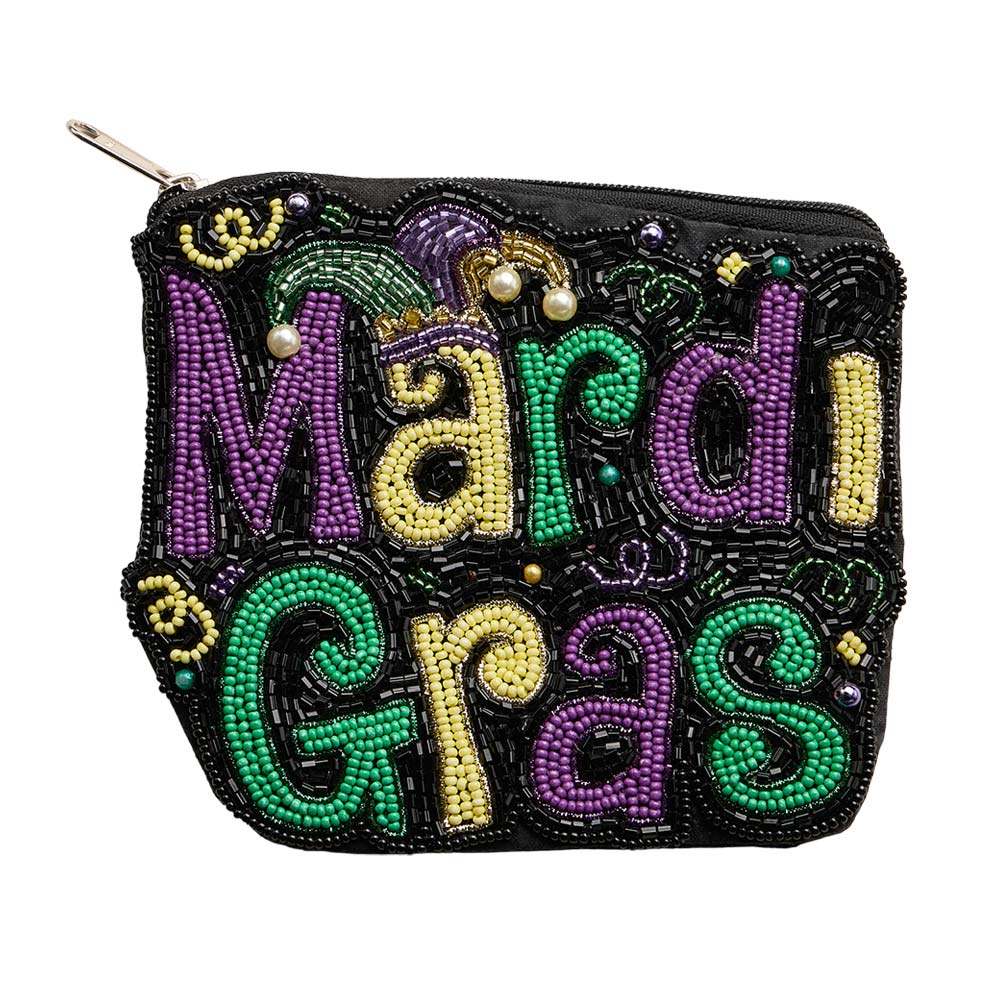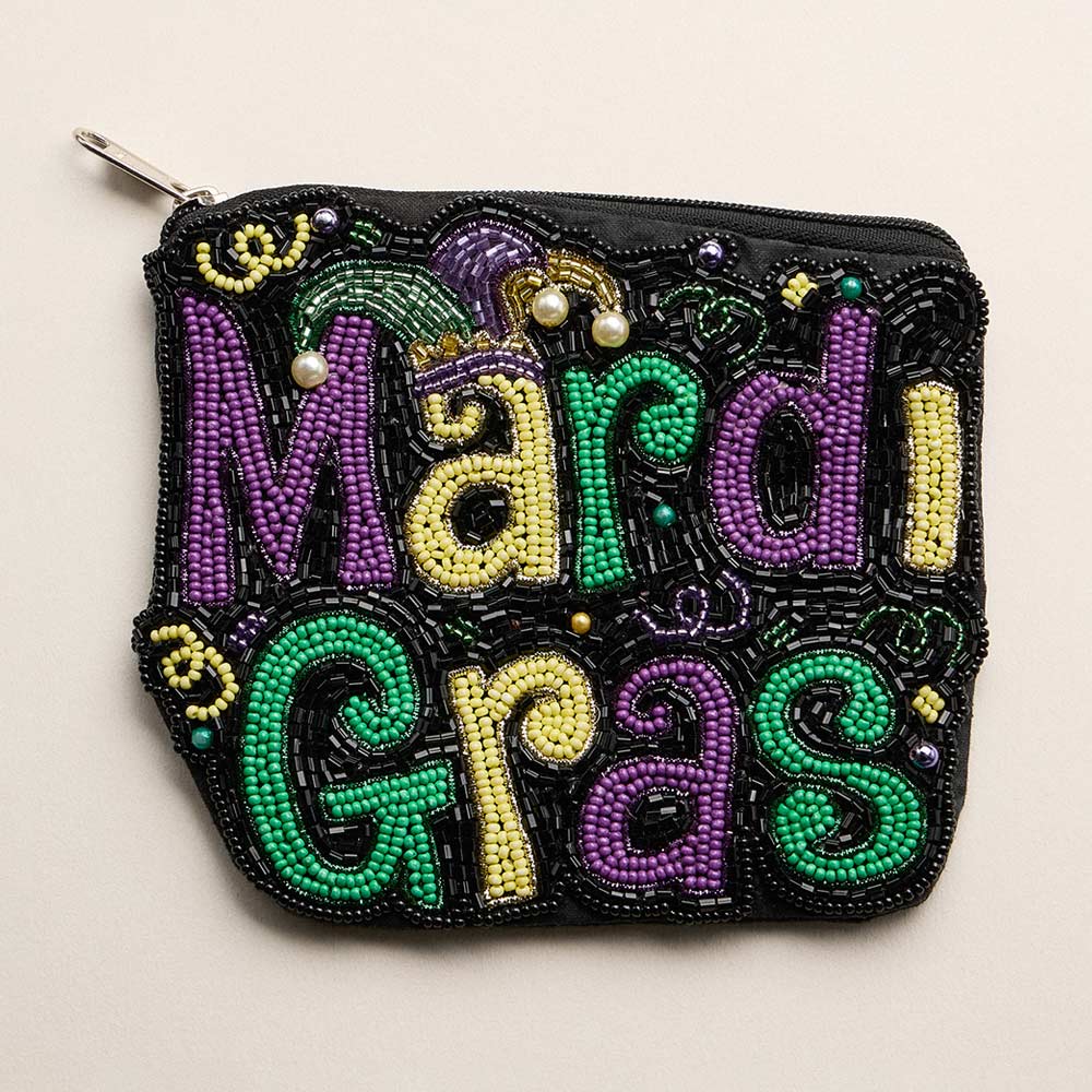 Details • Size : 5.25" X 4.5" (appx) • No Inside Pocket • Beads On Front Only • Bag Only (items are not included) • Zipper Closure • Eye-catching zipper pouch featuring bold Mardi Gras lettering with intricate beadwork, designed for storing cosmetics, accessories, or small essentials. A festive statement accessory ideal for seasonal assortments, gift shops, and boutique displays, offering playful style, strong shelf appeal, and everyday functionality for celebration-focused retail collections. • Made In India