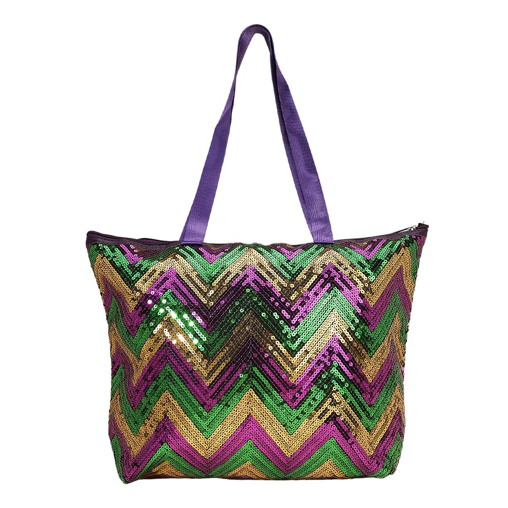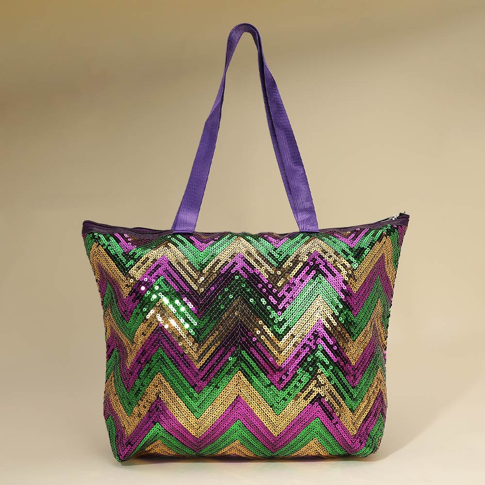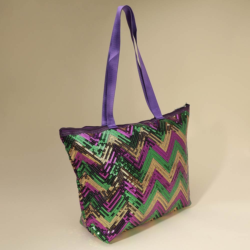 Details • Size : 18" X 13" X 6" • Top Handle Size : 11.5" L • Zipper Closure • Eye catching chevron sequin tote bag designed for festivals, themed events, travel, and everyday statement wear. Features a secure zipper closure, spacious interior, and comfortable shoulder straps. A strong boutique pick for seasonal displays, giftable collections, and customers looking for bold, functional fashion accessories.