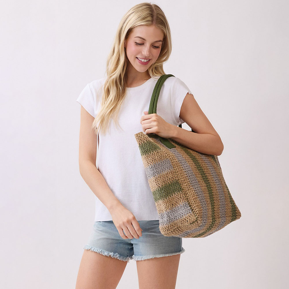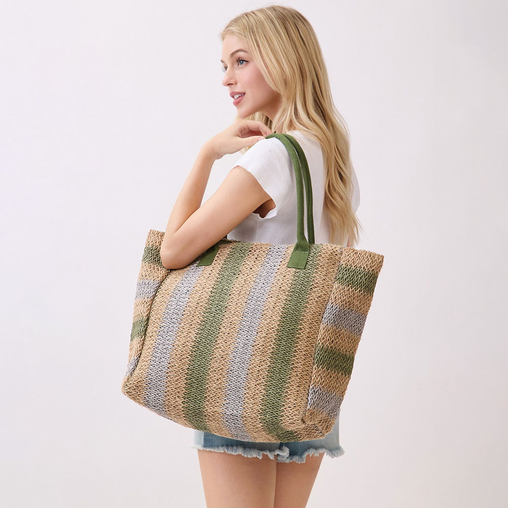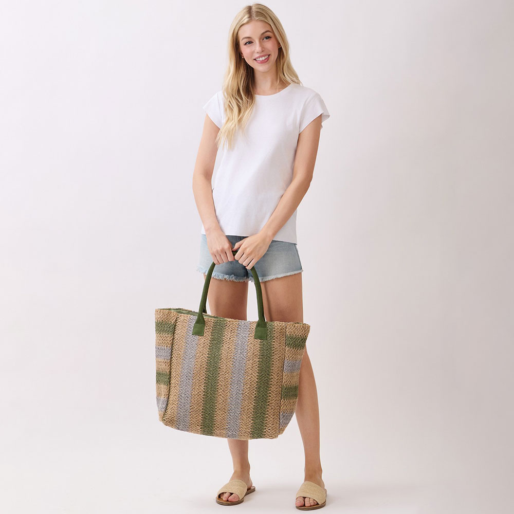 Details • Size : 21" X 14" X 6" • Inner Pocket • Magnetic Snap Closure • Material : 100% Paper • Spacious striped tote bag designed for everyday use, travel, shopping, and weekend outings. Features a roomy open interior to carry essentials, clothing, or accessories with ease. Comfortable shoulder handles offer effortless wear, making it a versatile choice for boutiques, resort shops, and seasonal collections.
