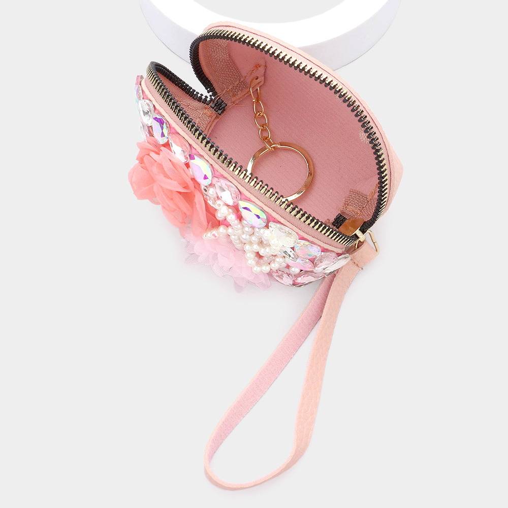 Details • Bag Size : 4.5" X 3.25" X 2.5" • Strap Size : 5" L • Inside Keychain Included • Zipper Closure • Charming floral accent coin purse wristlet with secure zipper closure, compact size, and convenient strap for easy carrying. Ideal for storing coins, cards, earbuds, or small daily essentials while staying lightweight and portable for errands, travel, gifting, or everyday organization.