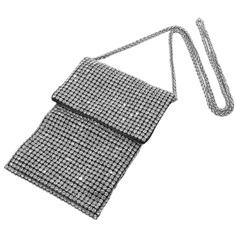 Details • Size : 5.25" X 7.25" X 0.75" • Strap Size : 40" L / Detachable • Magnetic Closure • Chic mini evening bag with shimmering rhinestone overlay and chain strap. Compact design perfect for carrying essentials at parties, weddings, or night outings. Adds sparkle to any outfit.