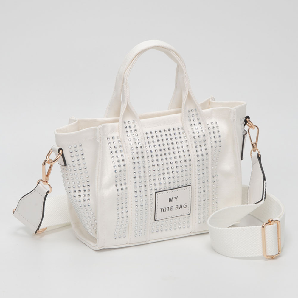 • Stylish small tote bag featuring a structured silhouette accented with sparkling embellishments for eye-catching appeal. Designed with top handles and an adjustable strap, this compact bag is perfect for carrying small essentials while adding a playful, fashion-forward touch to everyday looks and boutique collections.