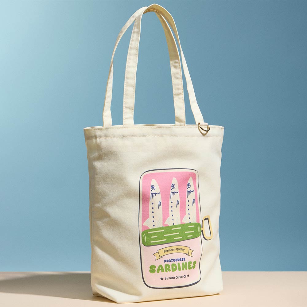 Details • Size : 14.5" X 14.5" • Top Handle Size : 8" L • Playful sardines graphic tote bag designed for everyday use and easy styling. Features comfortable shoulder straps and a spacious interior ideal for shopping, travel, beach days, or casual outings. A fun, novelty-inspired tote that adds personality to gift shops, boutiques, and seasonal lifestyle collections.