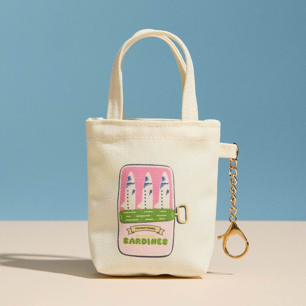 Details • Size : 4.25" X 5" • Strap Size : 2.5" L • Zipper Closure • Sardines mini tote keychain bag designed as a playful novelty accessory for keys, charms, and small essentials. Features a compact tote shape with top handles and attached keyring, perfect for bags, backpacks, gifting, summer themes, travel collections, and impulse-buy displays in boutique and lifestyle retail settings.
