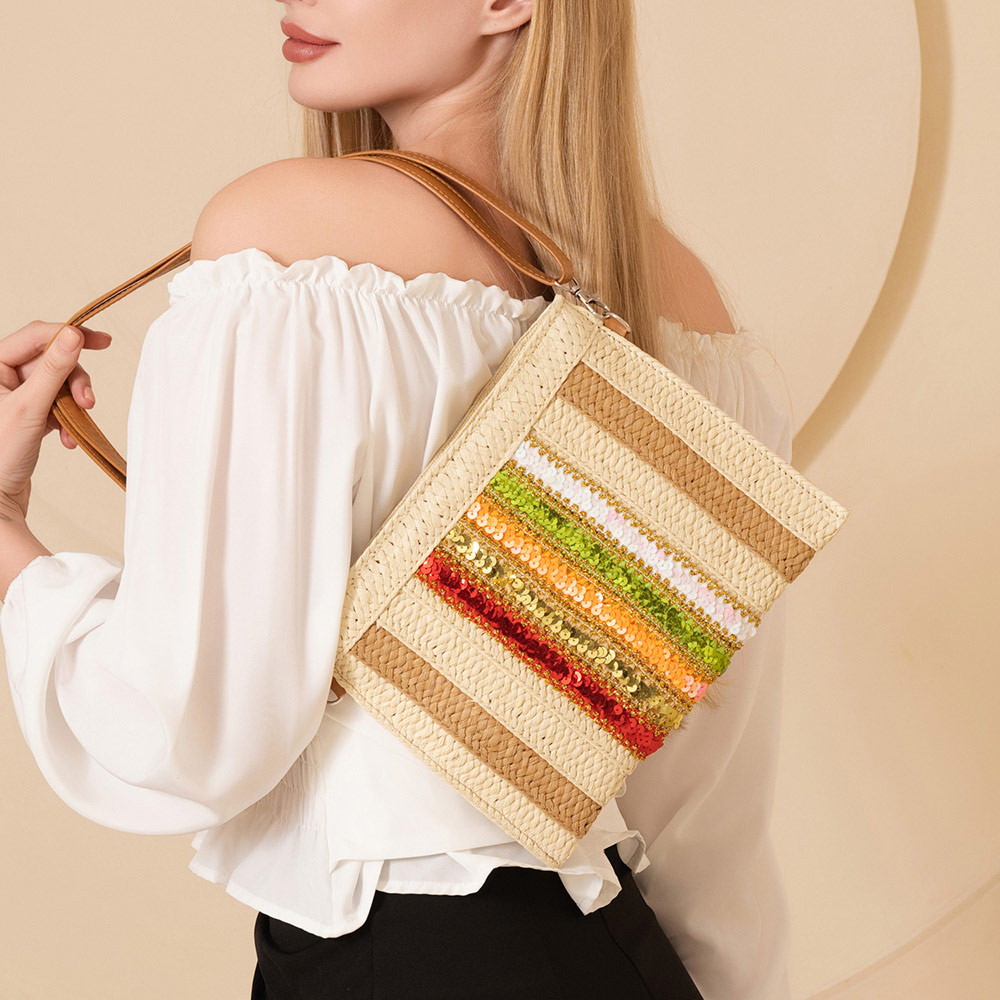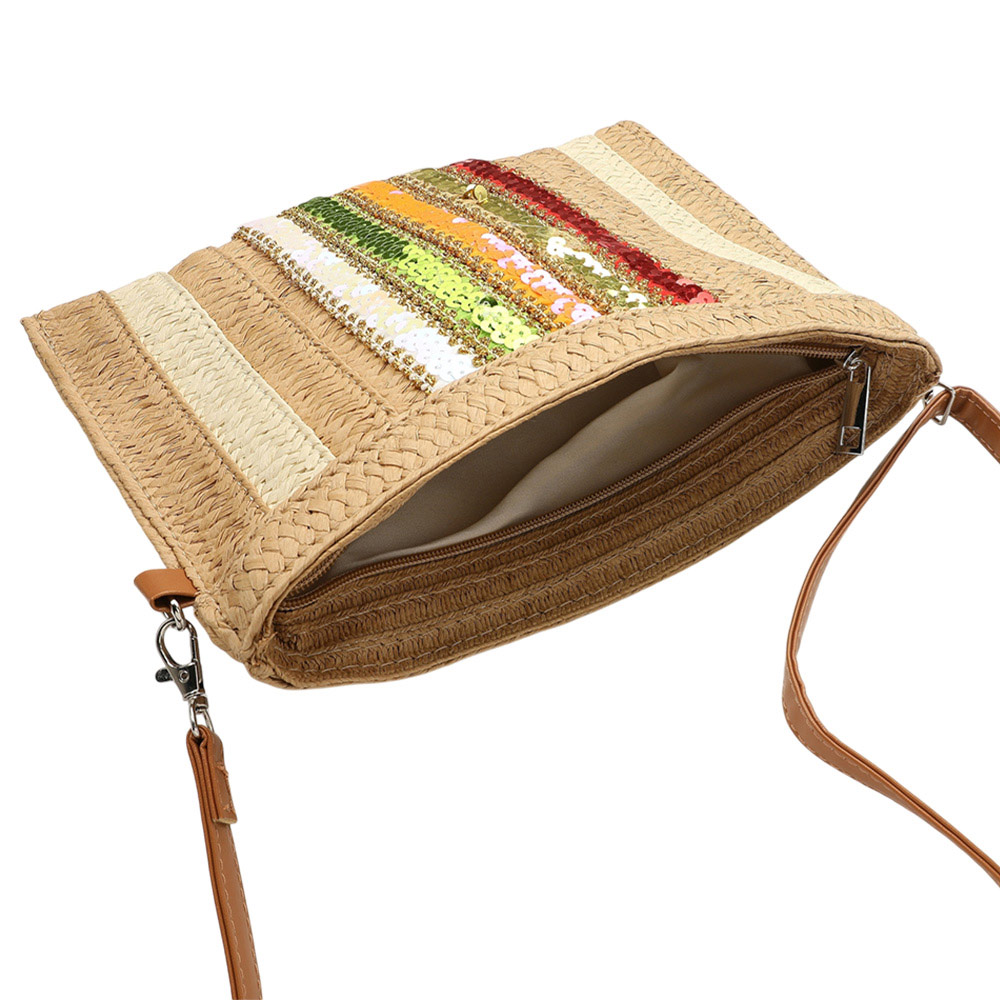 Sequin Striped Raffia Flat Crossbody Bag / Clutch Bag