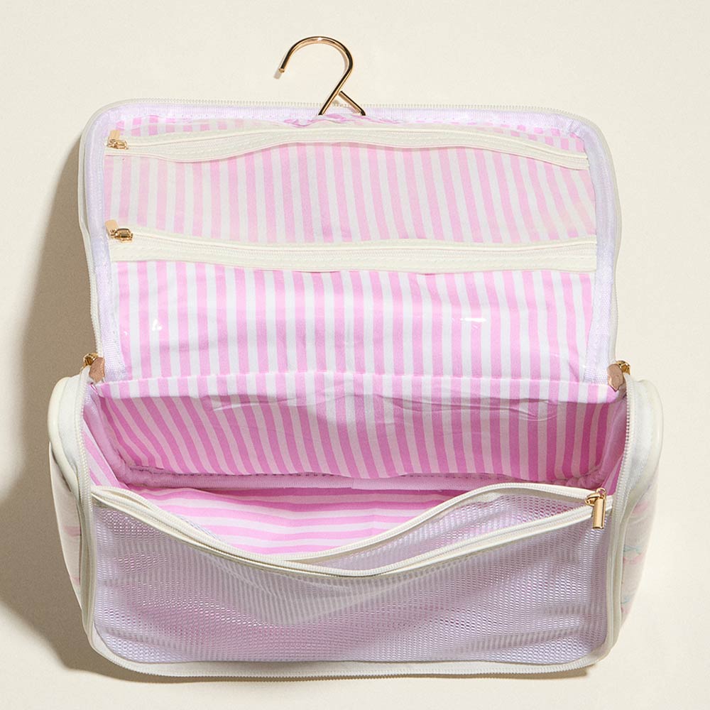 Details • Size : 10.5" X 9.5" • 2 Inside Zipper Slip Pockets • 1 Inside Mesh Pocket • Zipper Closure • A compact hanging travel organizer designed to keep beauty and personal essentials neatly stored. Features multiple zip compartments and mesh sections for easy visibility and access. Ideal for trips, gym use, or everyday organization with space-saving convenience.
