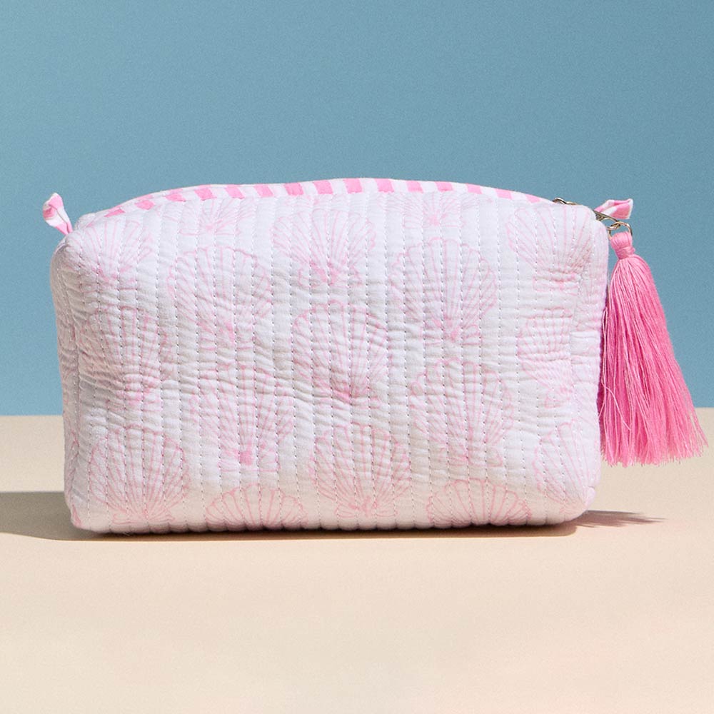 Details • Size : 6.5" X 4" X 3" • Zipper Closure • Quilted shell pattern cosmetic pouch designed for organizing makeup, toiletries, and small daily essentials. Features a softly padded structure, smooth zip closure, and tassel accent for added style. Compact yet roomy for travel, handbags, or vanity storage, making it a charming and practical accessory or gift option.
