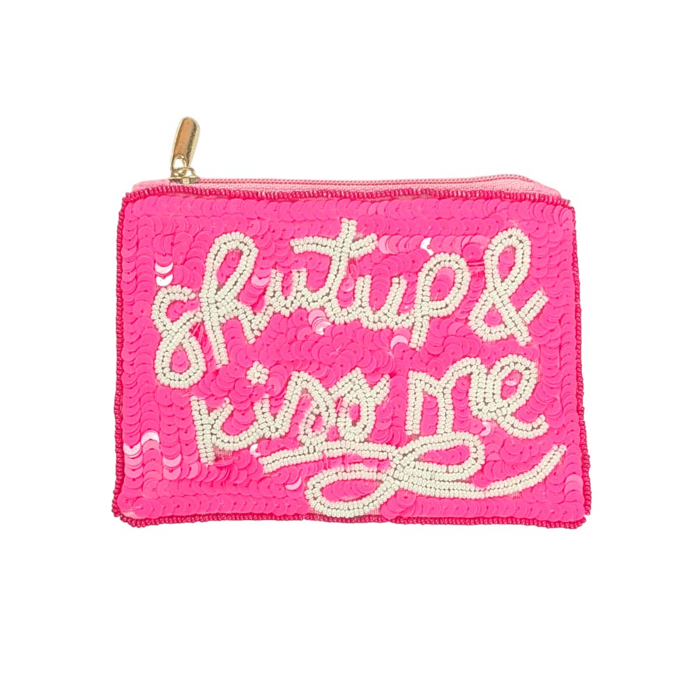 Details • Size : 5" X 3.75" • No Inside Pocket • Beads On Front Only • Zipper Closure • This playful beaded zip pouch features the bold phrase “Shut Up & Kiss Me,” making it a fun statement accessory for everyday use. Designed to hold coins, cards, keys, or small essentials, it offers compact storage with eye-catching charm. A great giftable item for Valentine’s Day, girls’ trips, or boutique collections, it adds personality and function to any accessory lineup. • Made In India