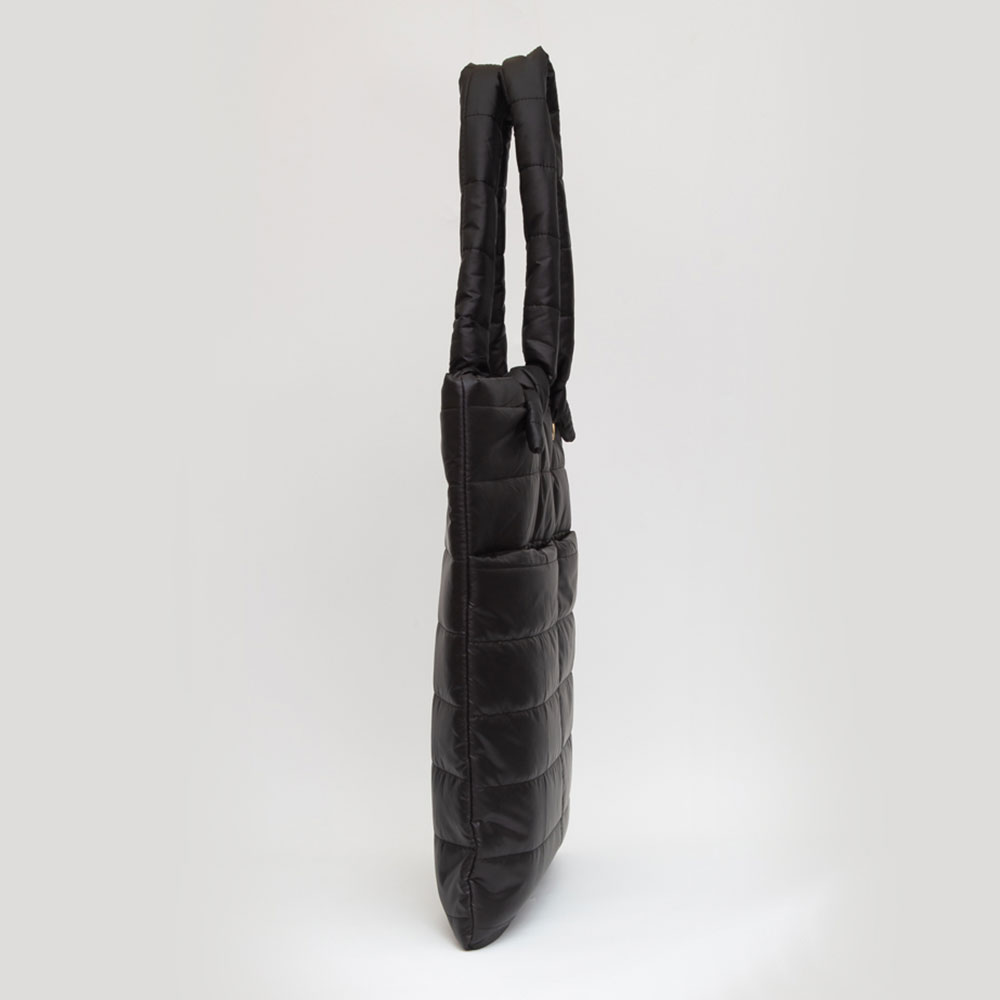 • A lightweight quilted tote bag featuring a sleek padded finish, roomy interior, and comfortable handles for effortless everyday carry. Its clean, modern silhouette makes it ideal for work, errands, or travel while adding a refined, cozy touch to any outfit.