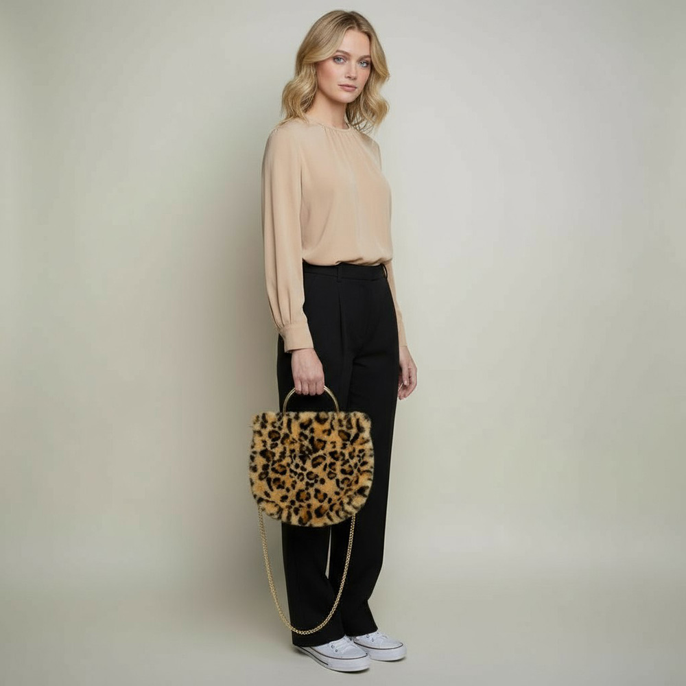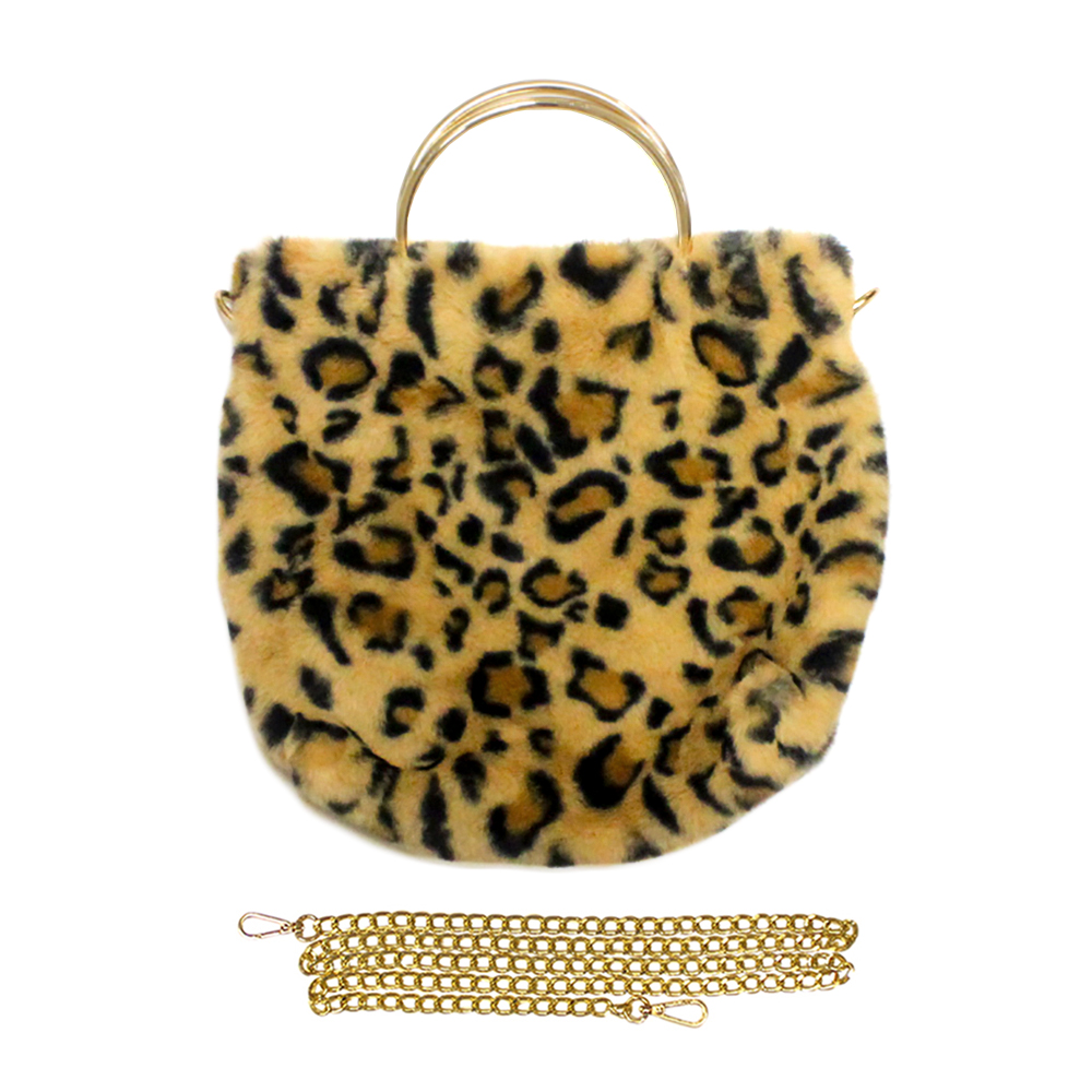 Details • Bag Size : 11.5" X 10.25" • Top Handle Size : 5" D • Strap Size : 24" L, Detachable • Material : 100% Polyester • Two Inside Slip Pocket • Magnetic Closure • Elevate your evening look with this faux fur crossbody bag, designed with a luxurious soft texture and elegant gold chain strap. Its compact silhouette and modern sophistication make it a perfect accessory for both special occasions and stylish everyday outings.