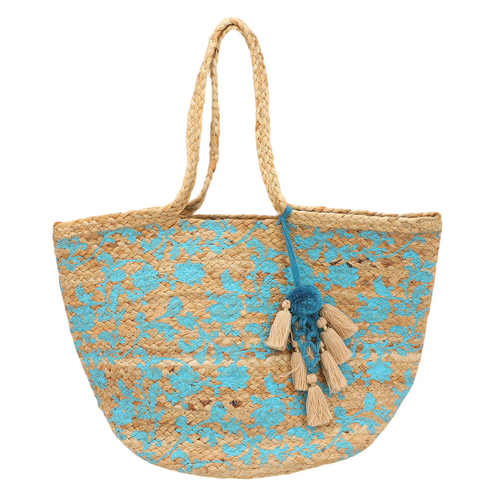 Details • Size : 20" X 11.75" X 9.5" • Strap Size : 9.15" L • Tassel Size : 12" L / Detachable • Make a stylish statement with this woven straw tote bag featuring vibrant blue floral embroidery and decorative tassels. Spacious and chic, it's the perfect carryall for beach days, markets, or weekend getaways. • Made In India