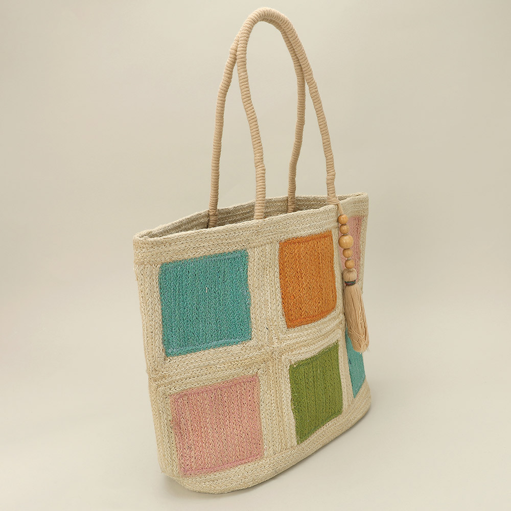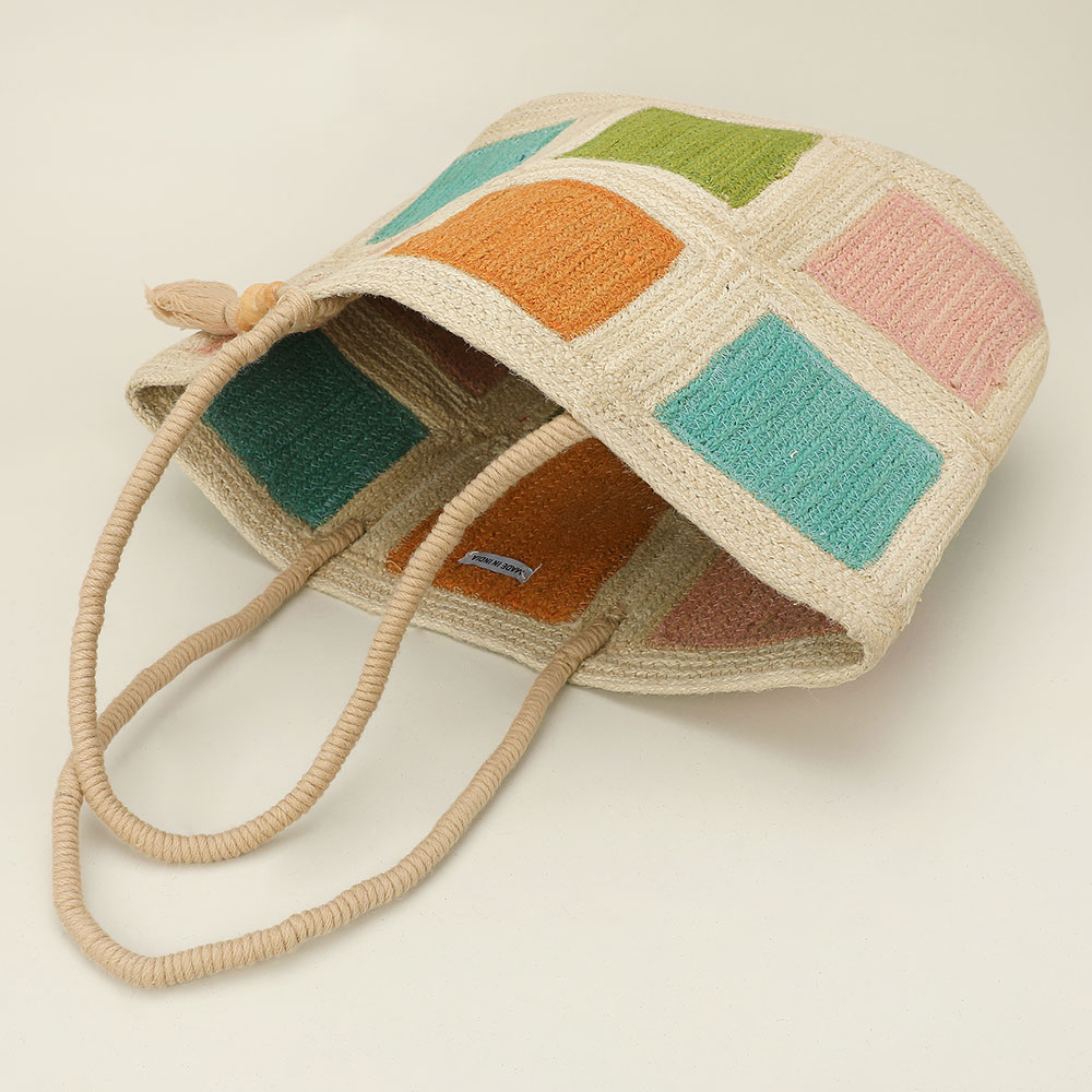 Details • Size : 17.5" X 12.5" X 6" • Top Handle Size : 8" L • Tassel Size : 8.5" L • Spacious woven tote bag designed with a patchwork-inspired pattern and decorative tassel accent for relaxed everyday style. Roomy interior comfortably carries daily essentials, making it perfect for shopping, travel, or casual outings. A lightweight, versatile accessory ideal for boutiques seeking unique, handcrafted-style statement bags. • Made In India