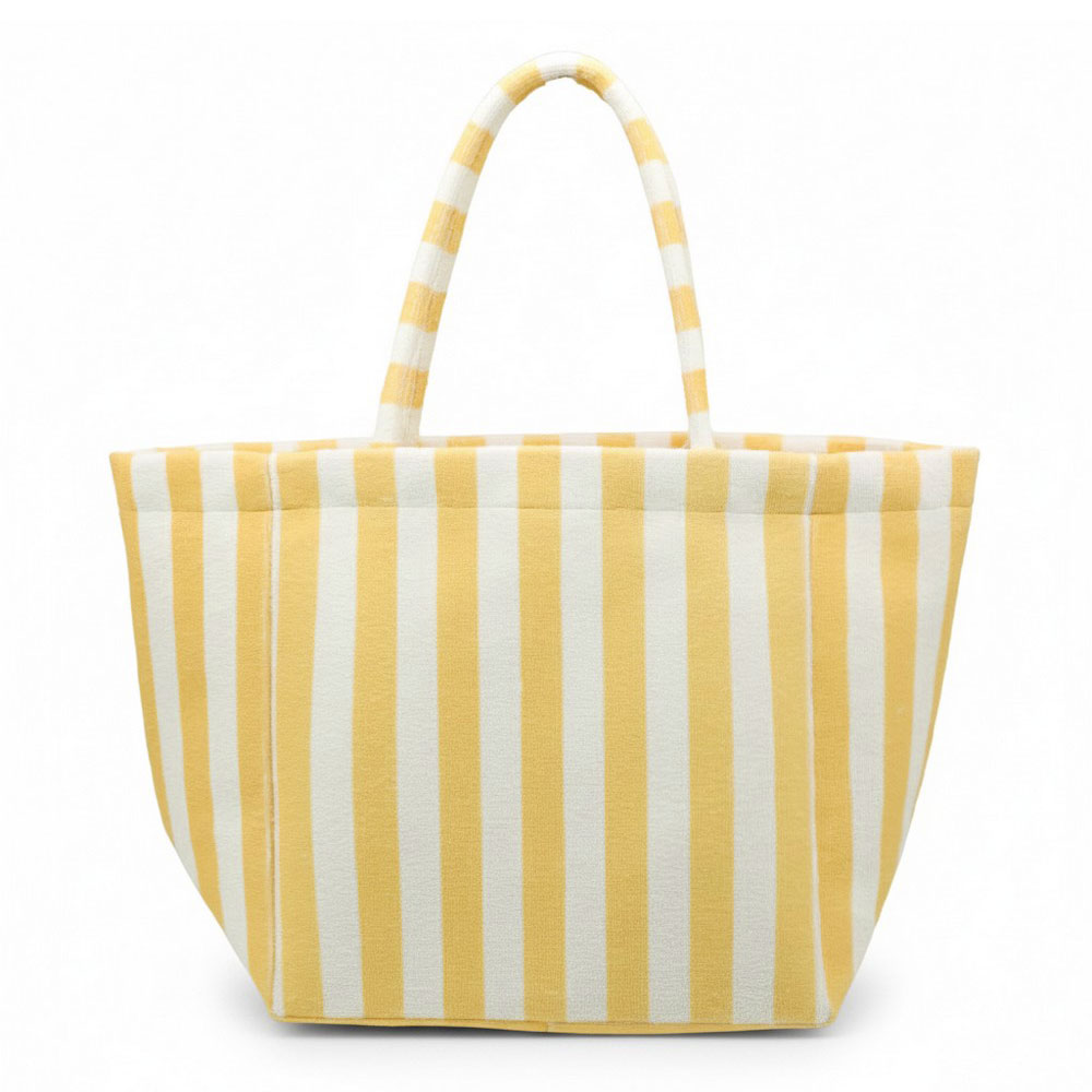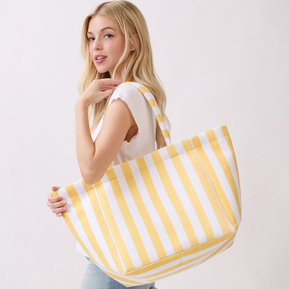 Details • Size : 22.5" X 13.5" X 9.5" • Inner Pocket • Magnetic Snap Closure • Material : 80% Polyester, 20% Polyamide • Classic striped tote bag designed for everyday summer use. Ideal for beach days, shopping, travel, or casual outings, this roomy carryall offers ample space for essentials while delivering a clean, timeless look that pairs easily with warm weather outfits and seasonal activities.