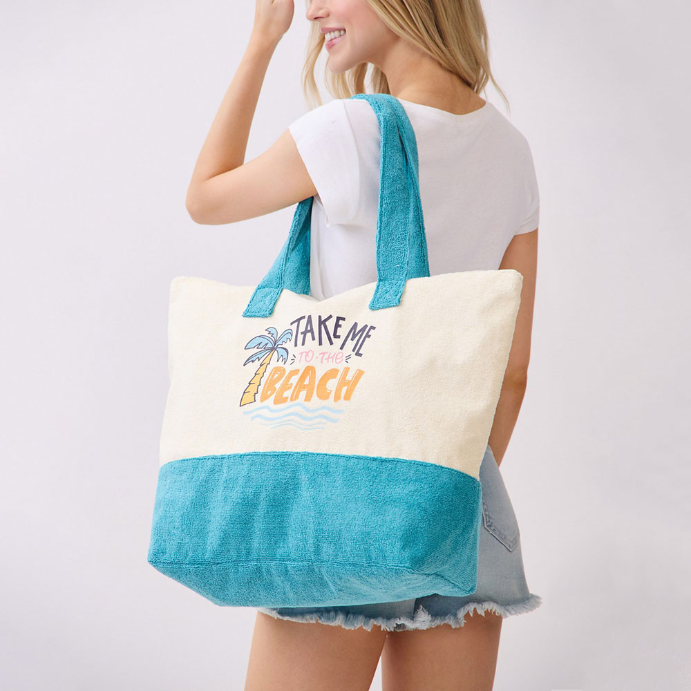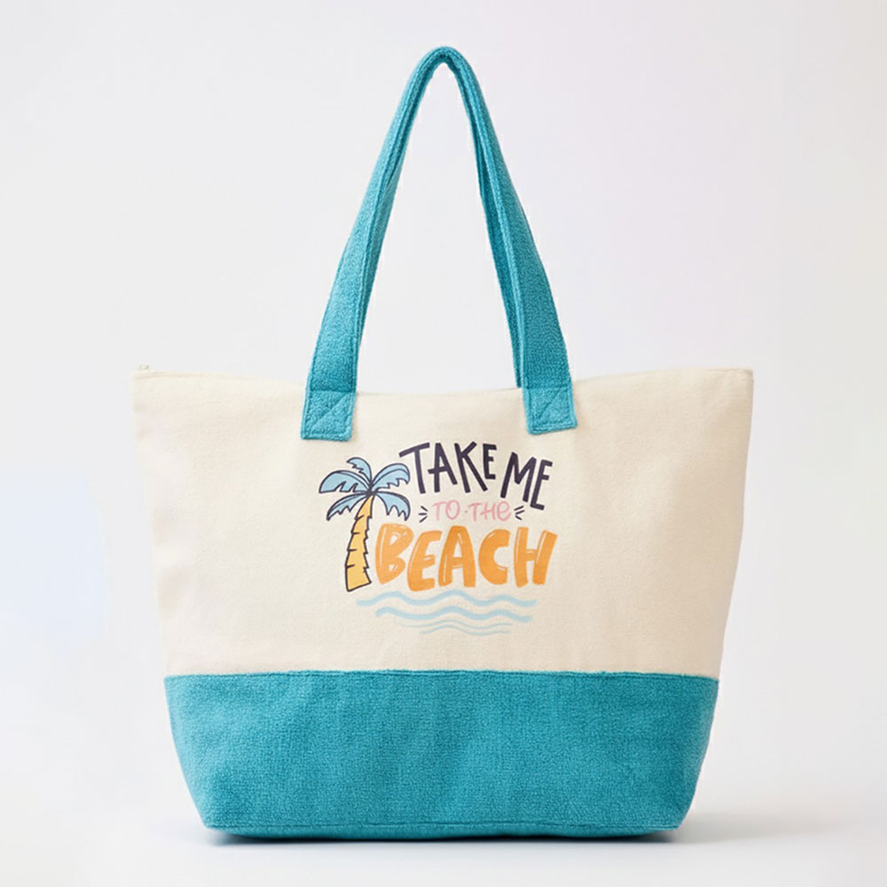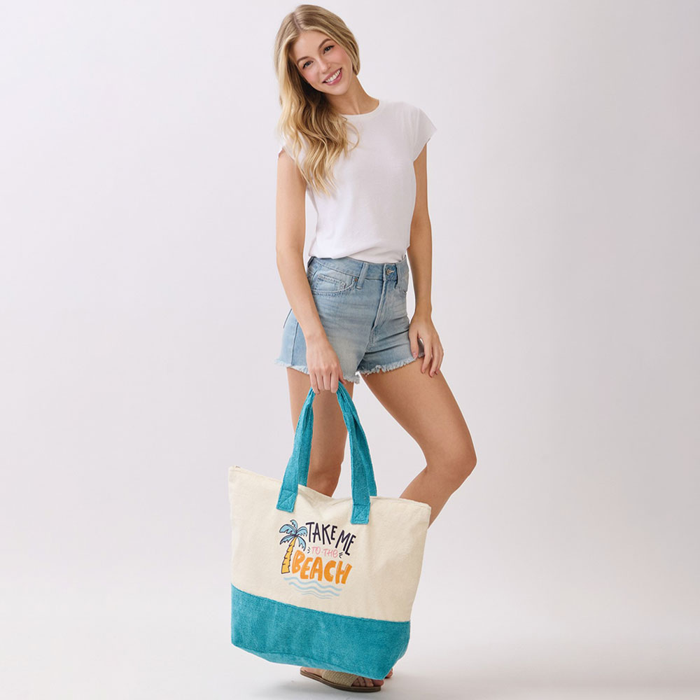 Details • Size : 22" X 16" X 6" • Inner Pocket • Zipper Closure • Material : 80% Polyester, 20% Polyamide • Beach inspired graphic tote bag featuring a playful “Take Me to the Beach” message. Designed for beach days, poolside outings, shopping, or vacation travel, this spacious carryall easily holds daily essentials while adding a relaxed coastal vibe to warm weather looks.