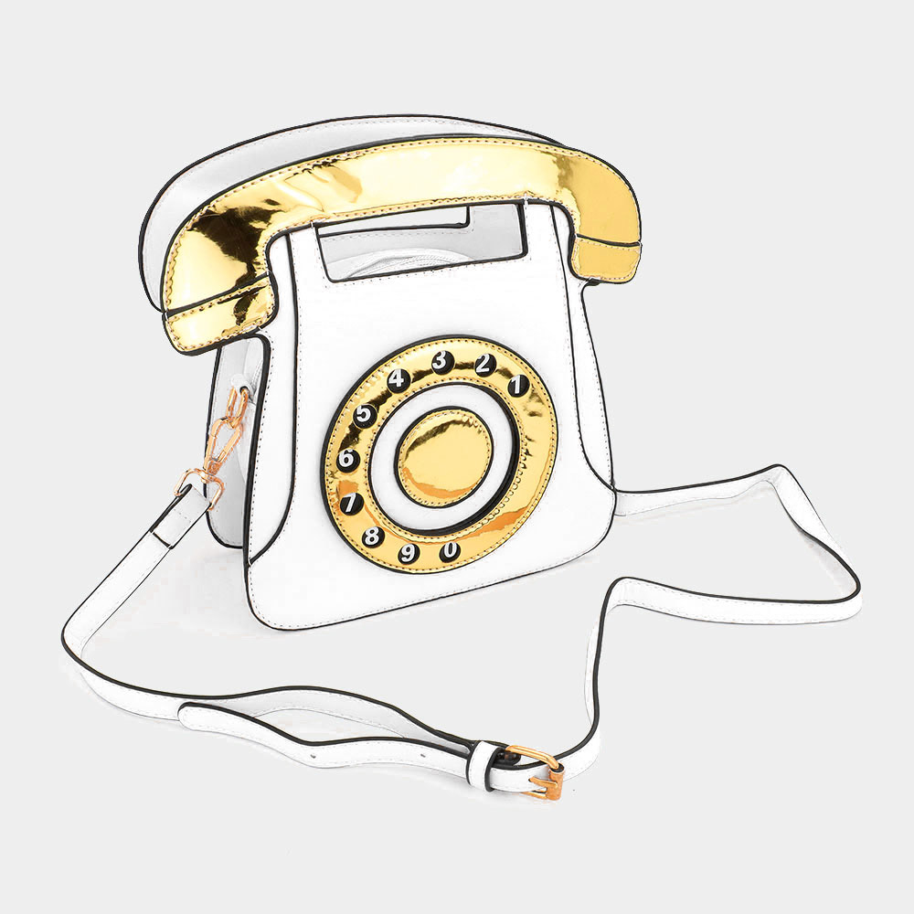 Details • Bag Size : 5.5" X 3.1" X 6.3" • Top Handle Size : 2.25" L • Strap Size : 40.5" - 48", Adjustable, Detachable • No Inside Pocket • Zipper Closure • Unique crossbody bag styled like a retro rotary phone with metallic accents and adjustable strap. A playful blend of nostalgia and function, perfect for bold fashion lovers seeking a standout accessory.