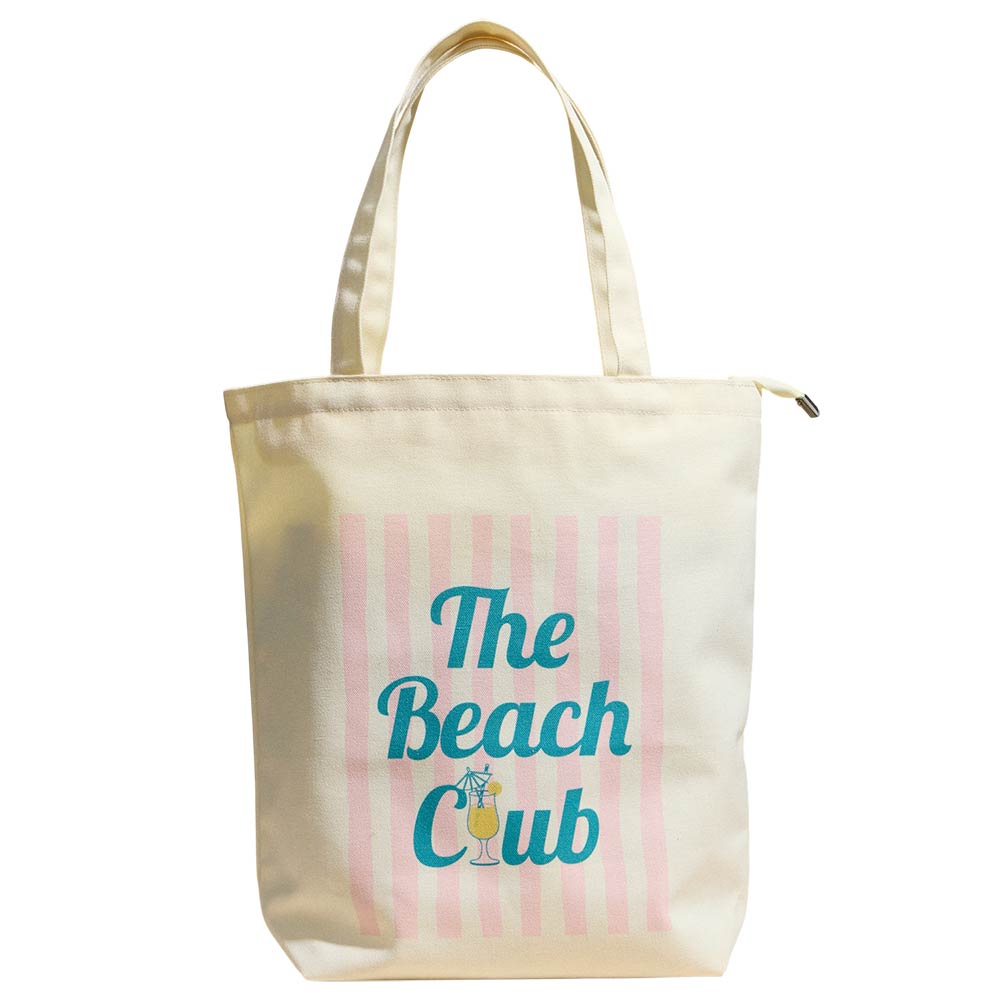 Details • Size : 14.5" X 14.5" • Top Handle Size : 8" L • Stylish Beach Club graphic tote bag designed for everyday use, travel, and seasonal outings. Features comfortable shoulder straps and a roomy interior ideal for shopping, beach days, vacations, and casual wear. A trendy statement tote perfect for gift shops, boutiques, summer collections, and lifestyle-focused retail displays.