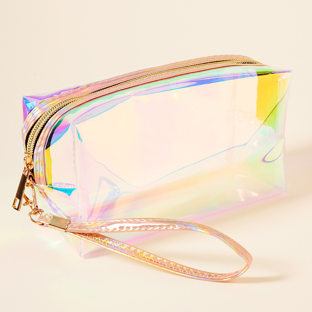 Details • Size : 7.25" X 3.8" X 2.75" • Wristlet Size : 6.6" L / Detachable • Zipper Closure • Material : 100% TPU • Chic holographic wristlet makeup bag with zipper closure, perfect for cosmetics, toiletries, and essentials. Lightweight, waterproof, and easy to carry with wrist strap, this stylish pouch is ideal for travel, daily use, or gifting, offering a modern design and organized storage on the go.