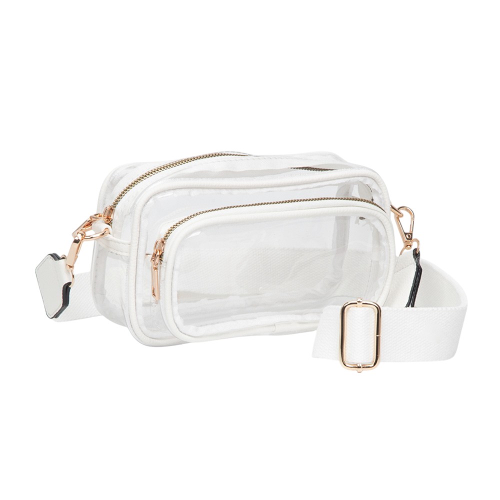 • Be game day ready with this clear stadium-approved crossbody bag, featuring white trim, dual zip compartments, and an adjustable strap for hands-free comfort. Perfect for concerts, sporting events, festivals, and venues with clear bag policies, offering style, security, and convenience on the go.
