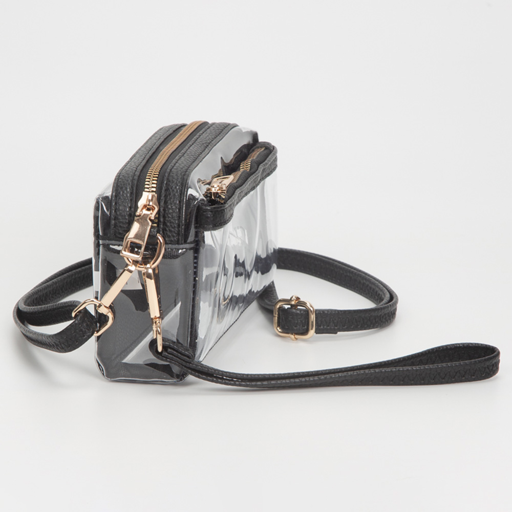 • Compact clear crossbody bag with dual zip compartments and an adjustable strap for convenient hands-free use. Perfect for stadiums, concerts, or travel, this transparent bag keeps essentials secure and visible while maintaining a stylish, practical design for everyday outings.