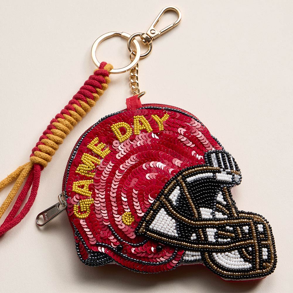Details • Size : 4.5" X 4.75" (appx) • Decor Size : 9" L • No Inside Pocket • Beads On Front Only • Bag Only (items are not included) • Zipper Closure • Eye-catching helmet-shaped keychain pouch designed with detailed beadwork and zip closure for small essentials. Perfect for game day displays, sports-themed collections, gifting, and impulse buys, this compact accessory adds playful personality while offering practical storage on the go. • Made In India