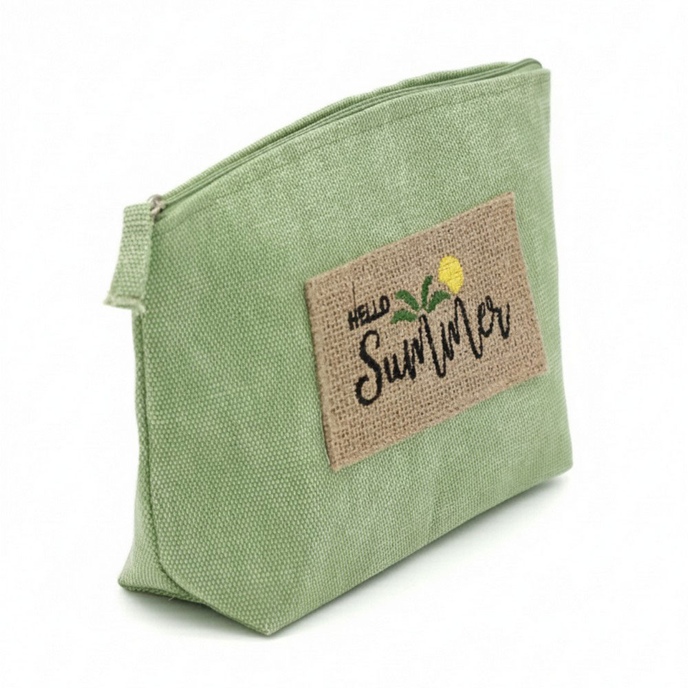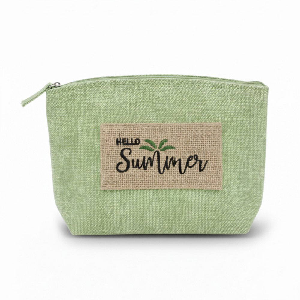 Details • Size : 9.5" X 6" X 2.5" • Zipper Closure • Material : 80% Polyester, 20% Burlap • Compact zipper pouch designed for daily organization, travel, and seasonal gifting. Ideal for holding cosmetics, accessories, or small essentials, this lightweight pouch offers easy storage and a clean silhouette that fits perfectly in totes, beach bags, and handbags for warm-weather use.
