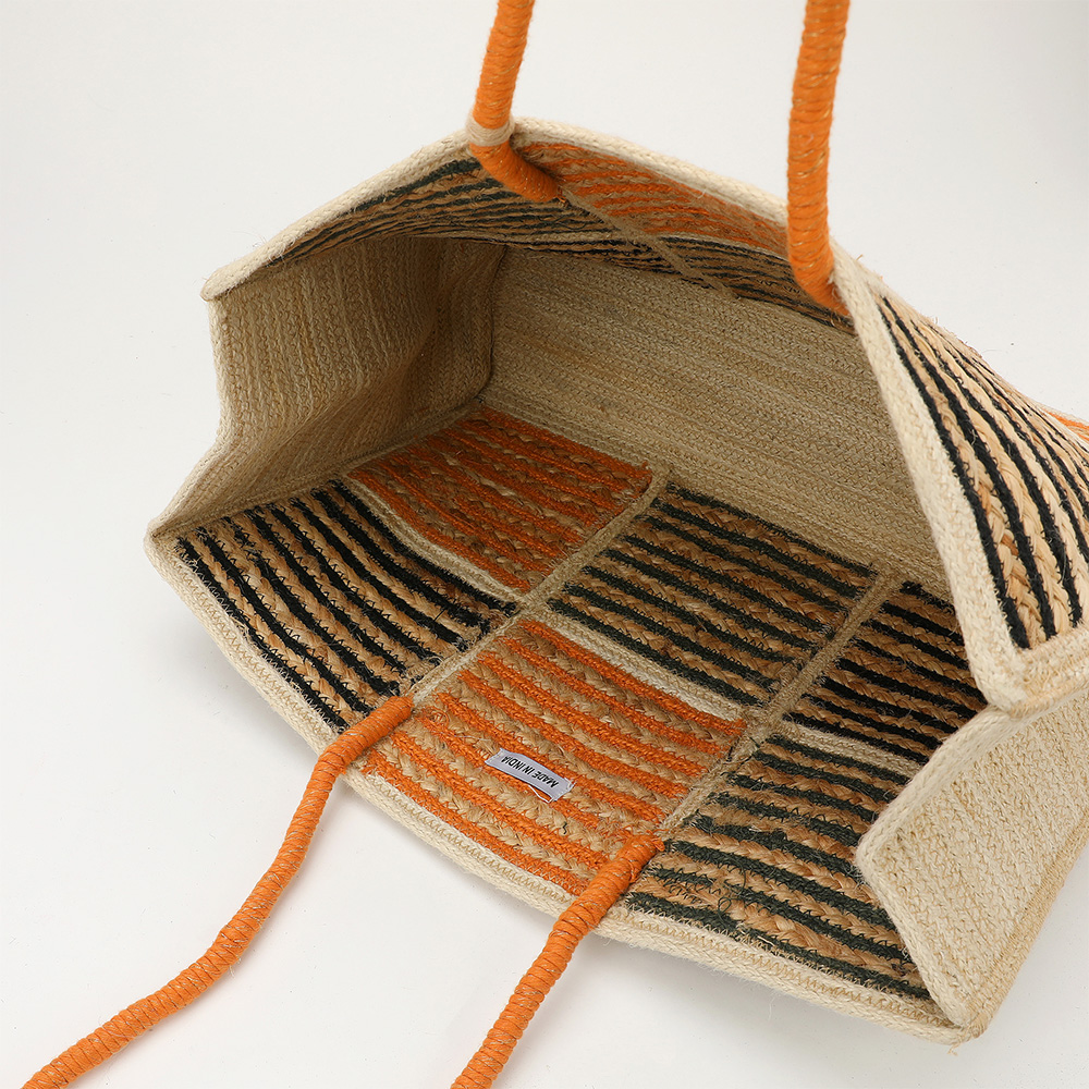 • Brighten your style with this woven straw tote featuring vibrant orange, black, and olive striped panels. With sturdy orange handles and a chic tassel charm, it’s perfect for everyday use or weekend getaways.