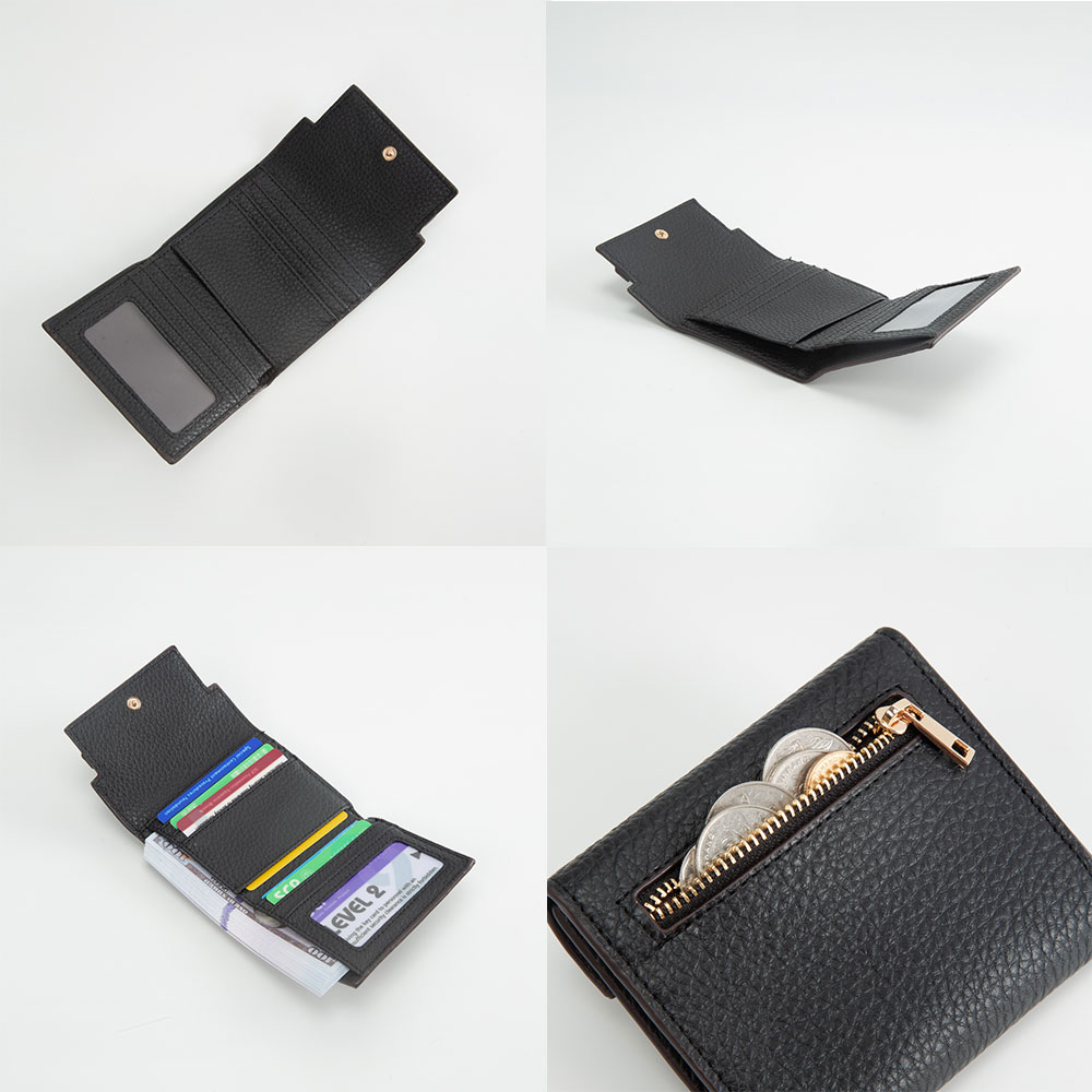 Details • Size : 4.25" X 3.75" X 1" • 5 Inside Card Slots • 1 Inside ID Window • 1 Inside Bill Compartment • 1 Outside Zipper Pocket • Snap Button Closure • This compact fold wallet with a sleek metal accent blends elegance with practicality. Designed with multiple card slots, an ID window, and a secure coin pocket, it keeps essentials neatly organized. Its refined structure makes it perfect for everyday use or travel convenience.