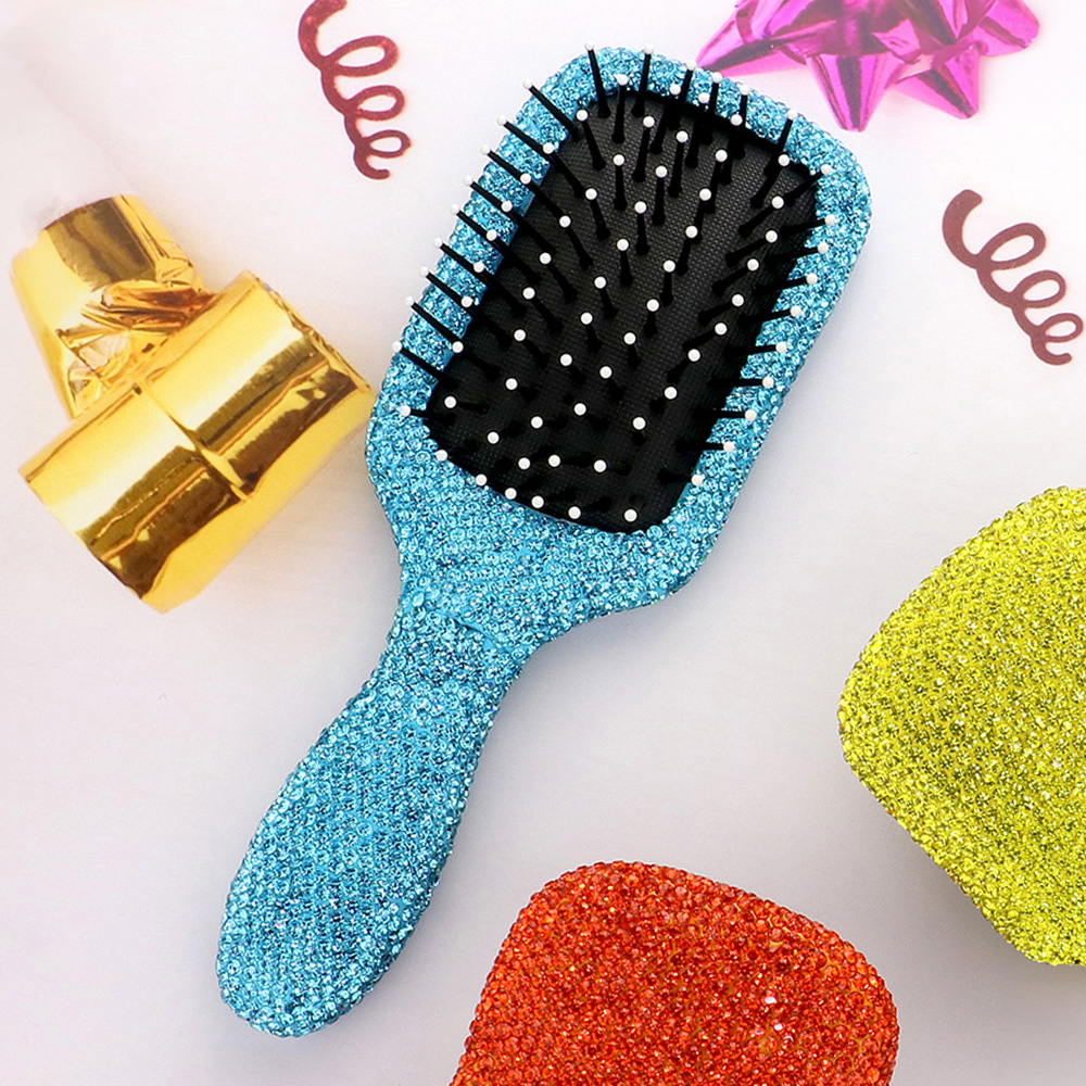 • Elegant paddle hair brush adorned with rhinestones for a stylish touch. Ideal for detangling and smoothing hair with ease, featuring ball-tip bristles for gentle grooming.