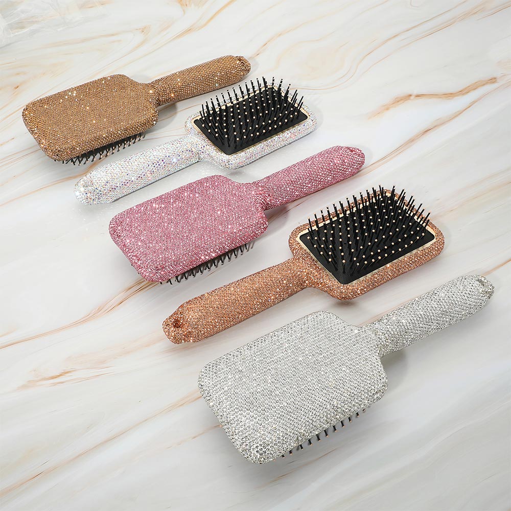 • Glamorous rhinestone paddle brush set with cushioned bases and ball-tip bristles. Ideal for detangling, smoothing, and styling hair comfortably with a luxurious look.