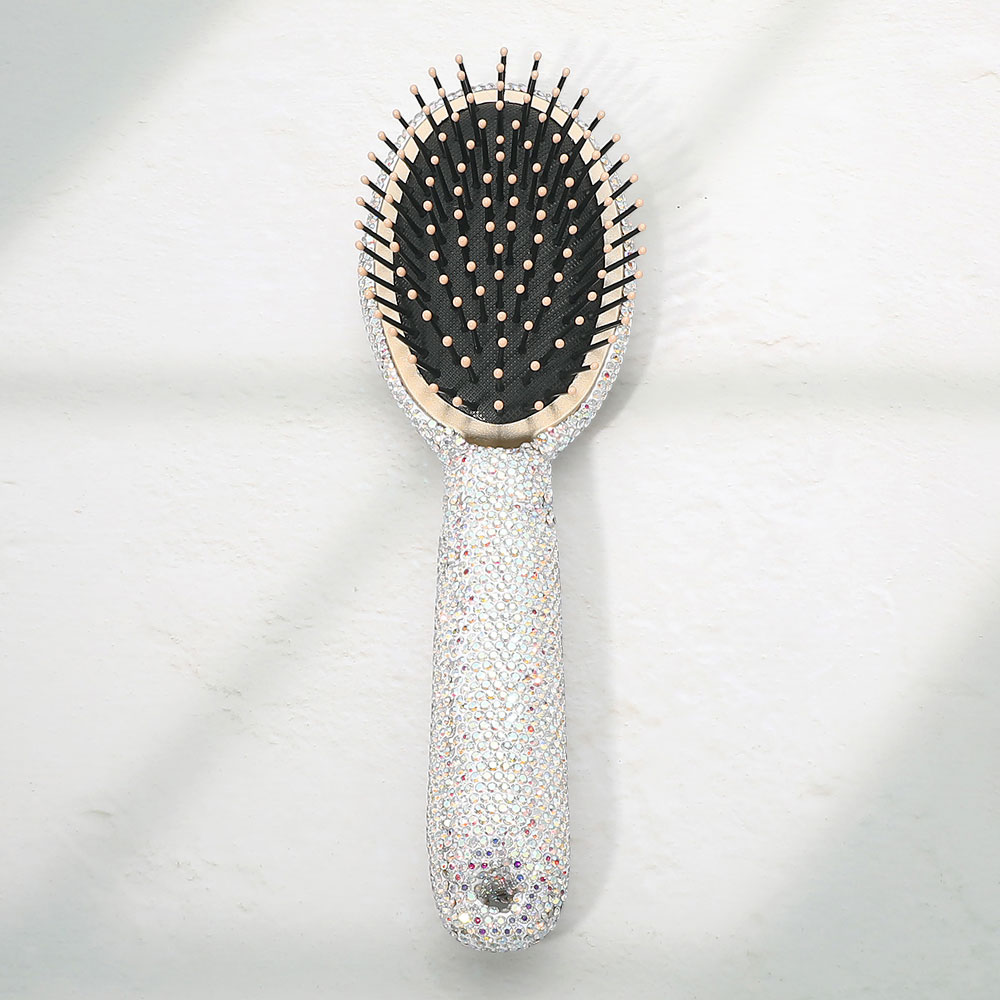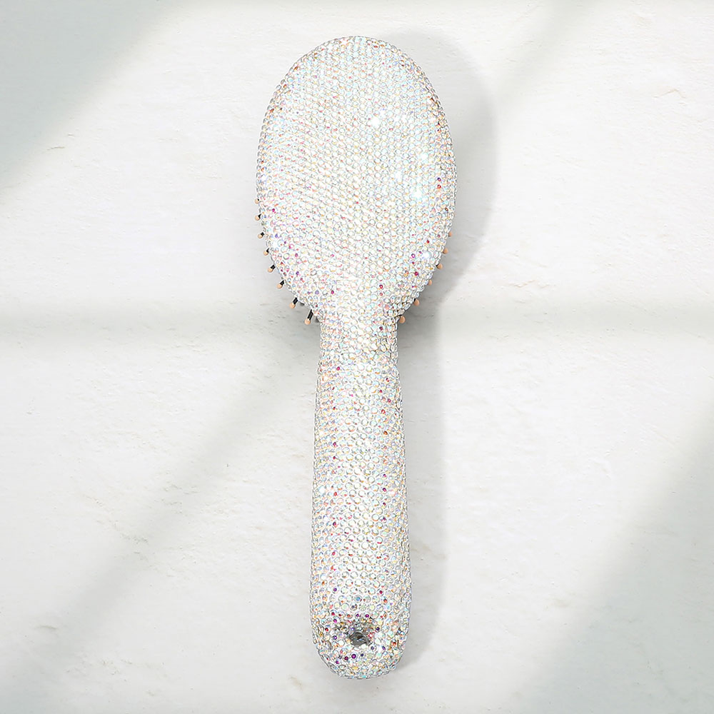 Details • Size : 3" X 9.5" • Statement hair brush designed with a crystal style handle and cushioned bristle base to help detangle and smooth hair with ease. Comfortable to hold and gentle on the scalp, this glam beauty essential is ideal for daily styling, gifting, or adding a polished touch to vanities and salon displays.