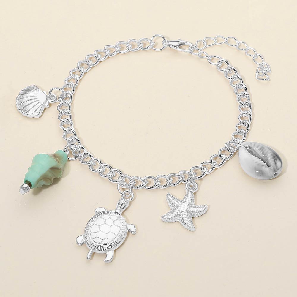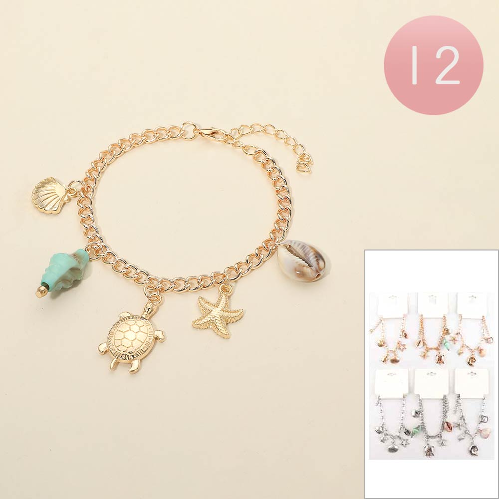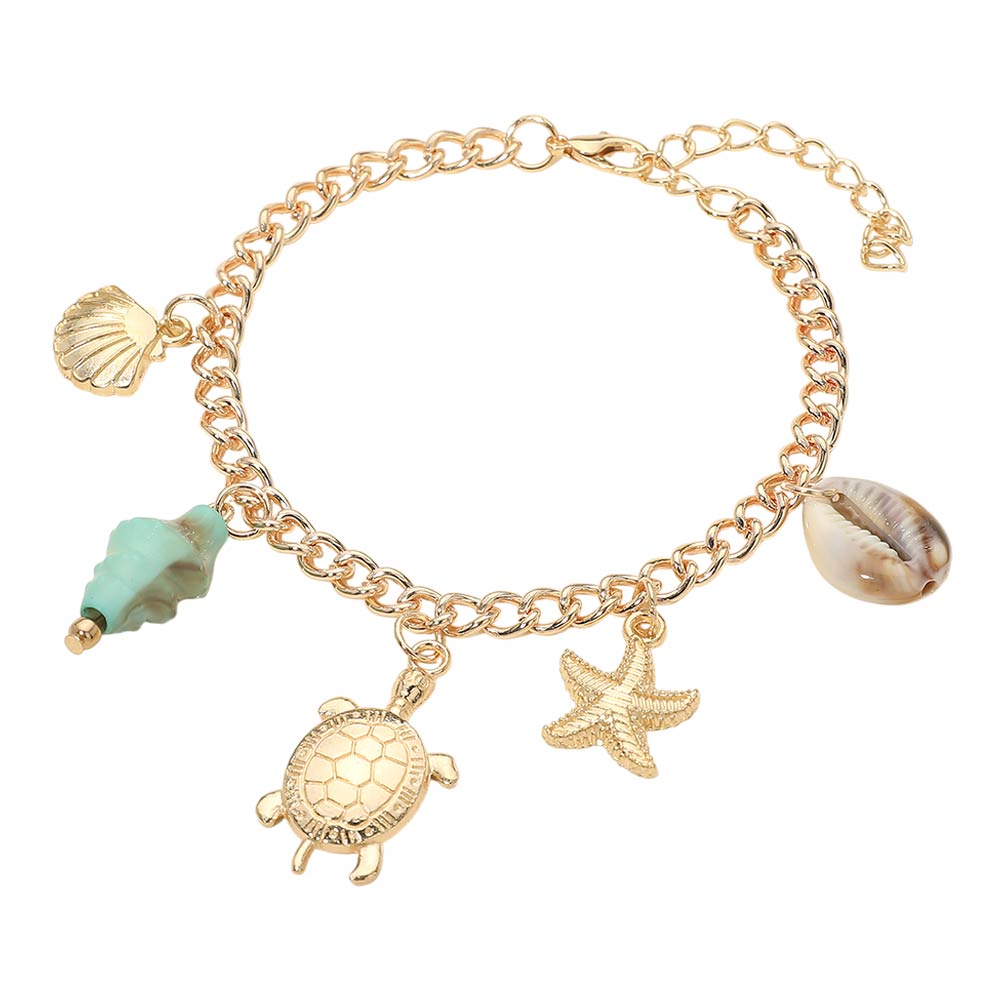 Details • Size : 0.2" H, 7.5" + 2.2" L • Charm Size : 1" L • Lobster Clasp Closure • This sea life charm chain bracelet features playful ocean-inspired charms including a turtle, starfish, shell accent, and natural-style bead detail. Designed with an adjustable chain for a flexible fit, it’s perfect for everyday styling, vacation-ready looks, and giftable charm jewelry collections for boutiques and seasonal assortments.