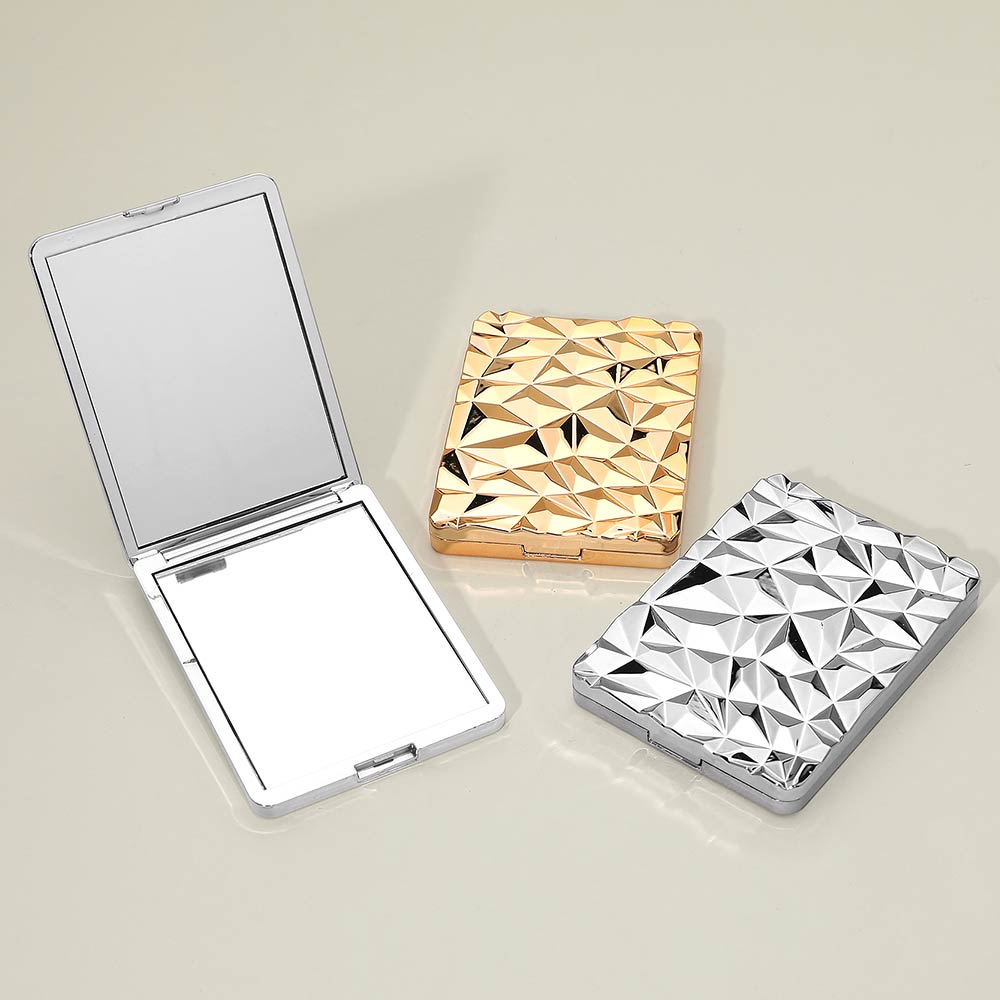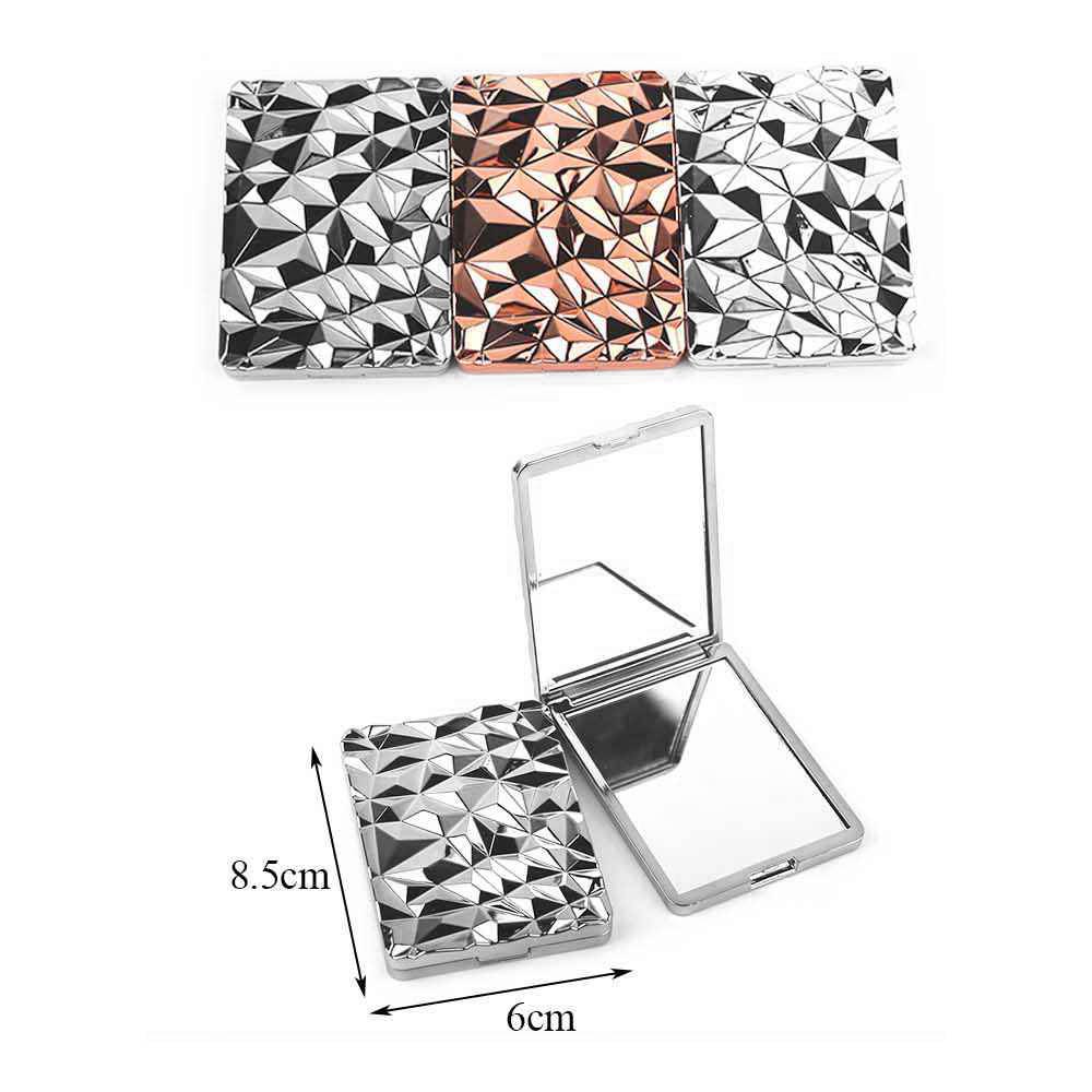 Details • Size : 2.4" X 3.3" • 2 In 1 - Plain Mirror And Magnifying Mirror • This geometric texture compact mirror features a sleek folding design with a clear reflective surface for quick beauty checks anytime. Slim and lightweight for easy storage in handbags or cosmetic pouches, it’s ideal for daily routines, travel, gifting, party favors, and boutique accessory collections.