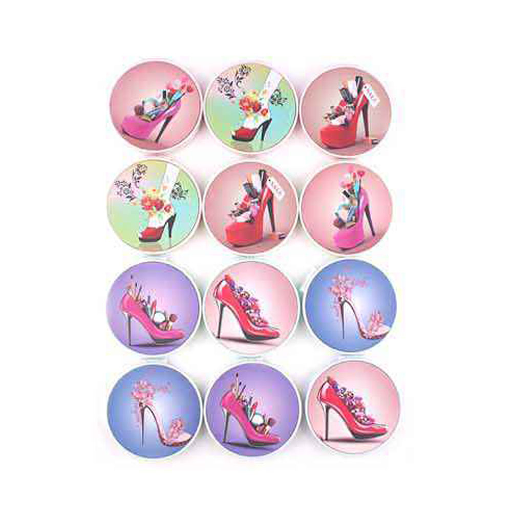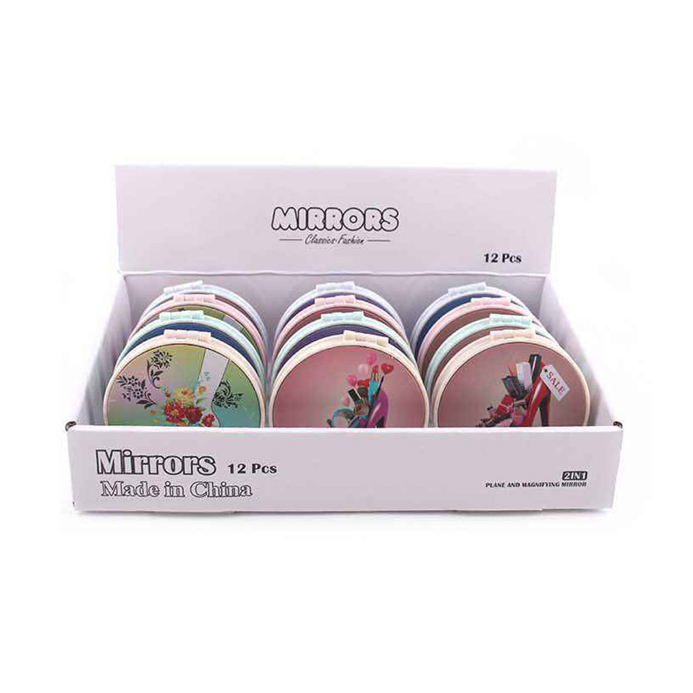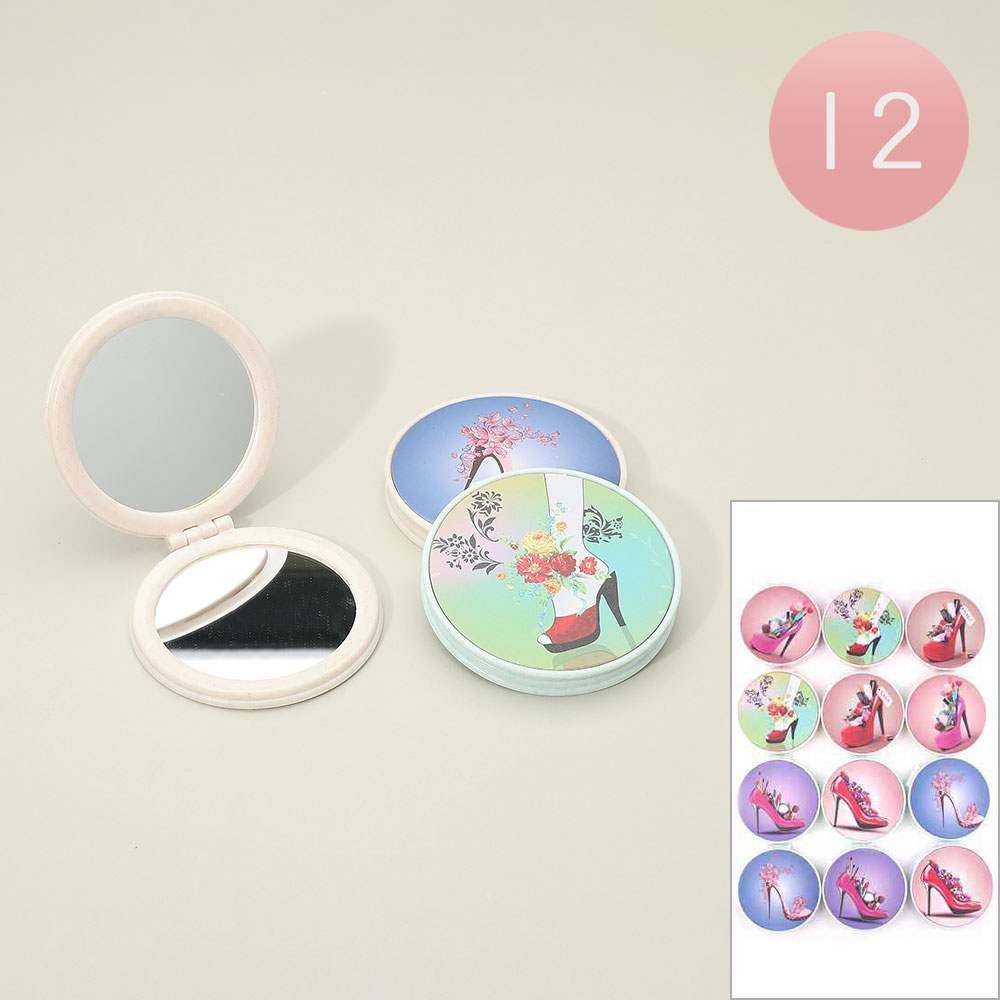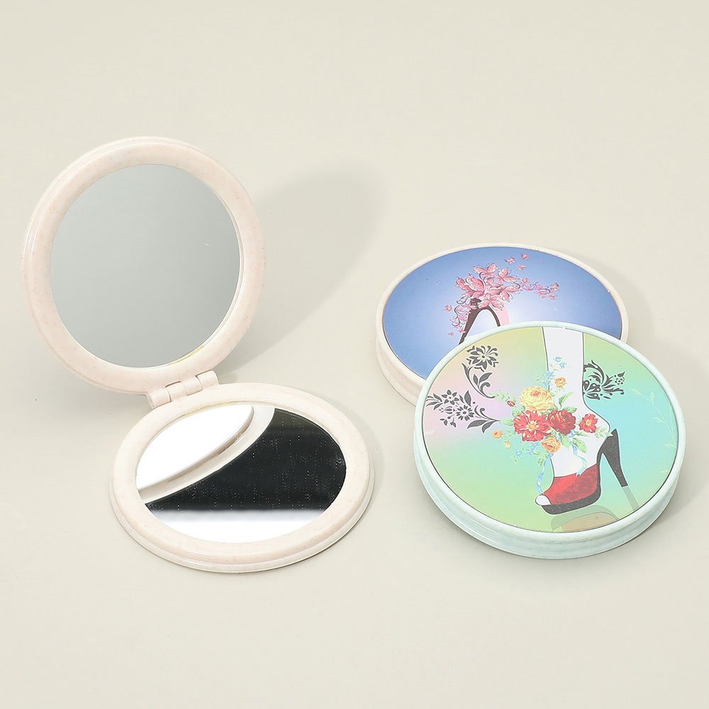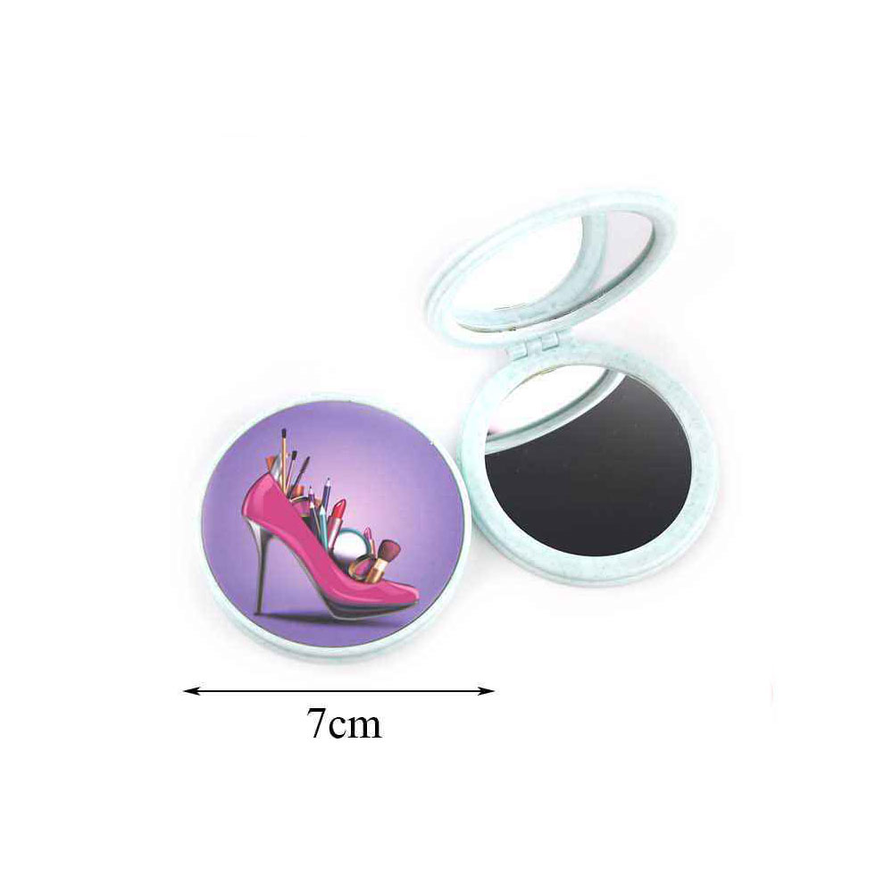 Details • Size : 3" X 3" • 2 In 1 - Plain Mirror And Magnifying Mirror • High heel art compact mirror designed for quick touch-ups and everyday convenience. Features a clear reflective surface with a stylish illustrated cover in a slim, portable shape. Ideal for handbags, cosmetic pouches, gift shops, and impulse displays, offering decorative appeal combined with practical daily use.