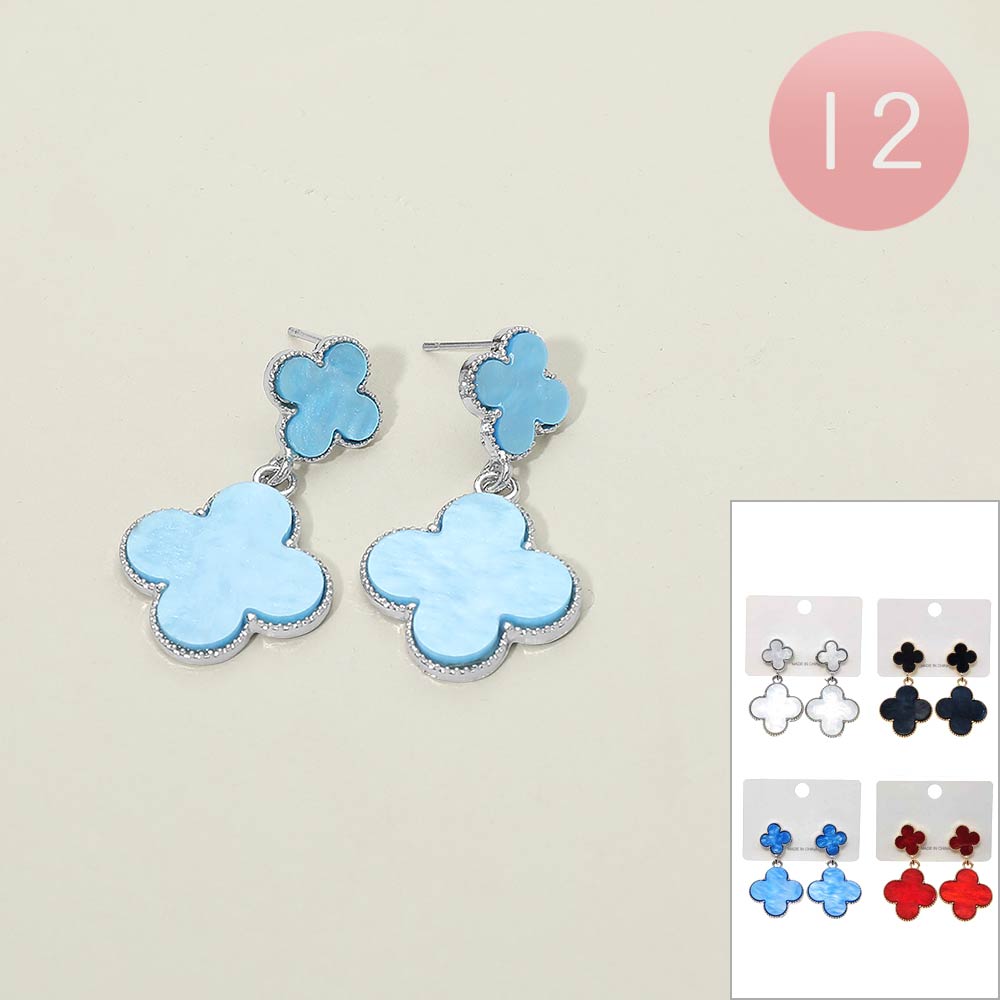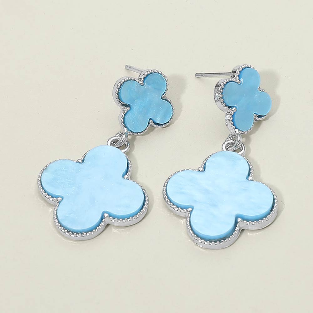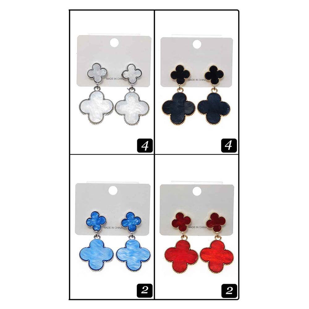 Details • Size : 0.8" X 1.7" • Post Back • Stylish drop earrings featuring a quatrefoil-shaped stud and matching dangling charm with a smooth, polished inlay. Designed with graceful movement and a balanced silhouette, these earrings offer a refined yet playful look, making them ideal for everyday styling, special occasions, gifting, and curated boutique accessory collections.